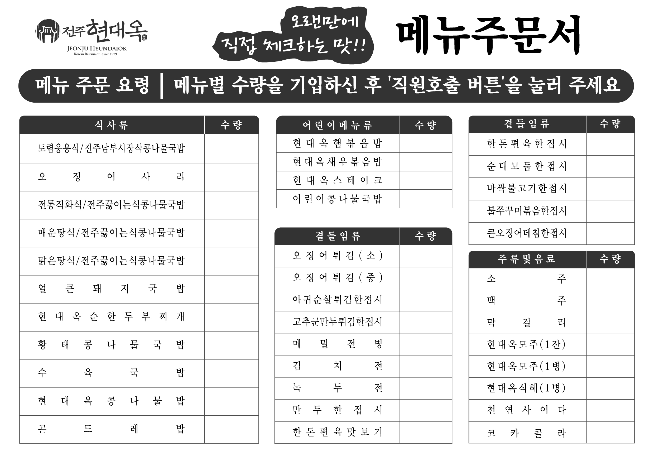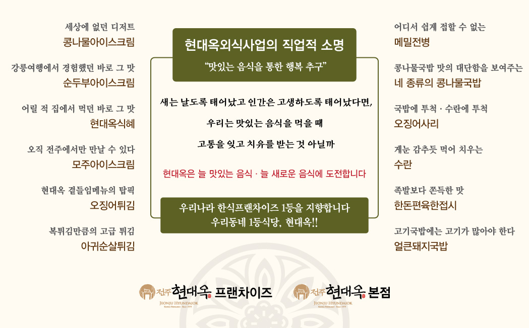 몇 달 전부터 현대옥본점에서는 '메뉴주문서'를 활용해 왔습니다. 고객과 직원간 메뉴 주문의 소통을 구두로 하던 것을 '주문서 작성'으로 전환한 것입니다. 구두로 하다보면 주문 오류의 발생 여지가 있는데 이러한 오류를 막아 내고, 요즈음 같은 비대면 시기에도 일정 시의적절하다 판단하여 시행하게 되었습니다. 메뉴별 가격에 대한 안내는 테이블 마다에 비치하고 있는 '메뉴북'에 기재되어 있습니다. 디지털 시대에서 "거꾸로 가는 아날로그"를 채택하면서 메뉴주문서에 추억과 재미를 넣고자, 어느 고객께서 표현하셨던 문구로서 "오랜만에 직접 체크하는 맛"을 새겨 넣었습니다. 메뉴주문서에 대하여 고객 반응은 대체로 성공적이었는데, 이러한 주문서도 '혁신'으로 규정하면서 금번 아날로그 주문서의 시행을 모든 가맹점에 독려하고 있습니다. 한편, 본점2층에 운용 중인 '고객대기실'을 몇 년만에 재단장 하였는데, 대기실 내 '부착물'을 새로운 것으로 교체하고 위치 변경하기도 하였습니다. 새로운 부착물은 전국 각지에서 오시는 여행객께나 전주시민들께 "현대옥외식사업의 직업적 소명"을 알리는 내용입니다. 현대옥가맹본부는 "현대옥은 늘 새로운 음식, 늘 맛있는 음식에 도전합니다."를 표방하며 많은 신메뉴들에 끊임없이 도전해 왔는데, 그 배경과 이유를 어디에 두고 있을까. 콩나물국밥도 네 가지나 취급하고 있는데 그 이유는 무엇일까? 현대옥의 직업적 소명의식은 "맛있는 음식이 주는 행복감"입니다. 외식사업을 하는 사업체로서는 "새는 날도록 태어 났고 사람은 고생하도록 태어났다면, 우리는 맛있는 음식을 먹을 때 고통을 잊고 치유를 받는 것이다."라는 인식을 뼈 속 깊이 갖고 있는 것으로부터 고객을 돈으로만 보는 것이 아니라 음식으로 위로를 주어야 할 '사람'으로 보는 눈이 트인다라고 생각합니다. 아래에 '메뉴주문서'와 본점2층에 게시하고 있는 새로운 부착물의 사진을 첨부해 놓습니다. <메뉴주문서>