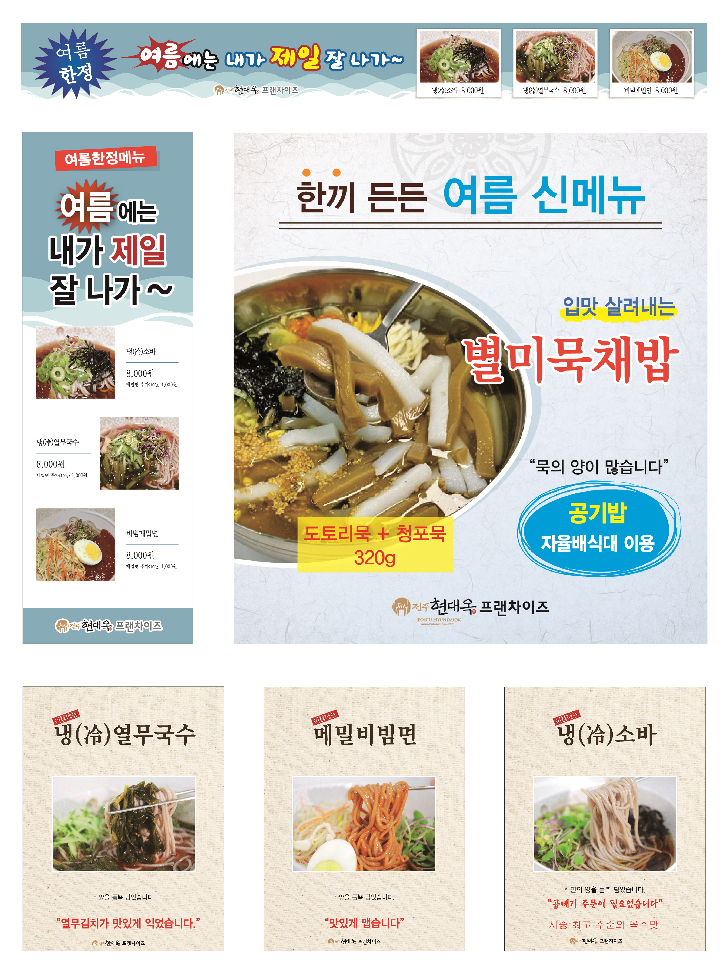 일선 가맹점에서 매년 여름 한정 판매하는 여름메뉴들이 금년에도 판매 개시되었습니다. 여름 메뉴들은 그 간 수 년간 판매해 오면서 상품성이 검증된 것들이어서 가맹점 매출에 도움이 될 것으로 기대합니다. 판매 개시하는 여름메뉴들은 냉소바 비빔소바 열무국수 별미묵채밥 등인데, 맛 동질성 차원에서 이 메뉴들에 대한 식자재는 가맹본부에서 일괄 공급하며, 가맹점별 취급 여부와 메뉴 선택은 가맹점 자율선택에 맡기고 있습니다. 현대옥본점에서는 수 년 전 해당 메뉴들을 시험 출시하고 판매하여 왔는데, 작년 여름부터는 판매 중단하였습니다. 신메뉴가 개발되고 출시되는 과정에서 반드시 본점에서 시험 출시를 거치게 되는데, 여름 메뉴들도 본점이 당연히 해야 할 역할을 마무리하고 또 다른 신메뉴들을 개발 론칭하고자 하면서 해당 메뉴들의 판매를 중단하게 된 것입니다. 아래에 여름메뉴들에 대한 홍보물을 첨부해 놓습니다.