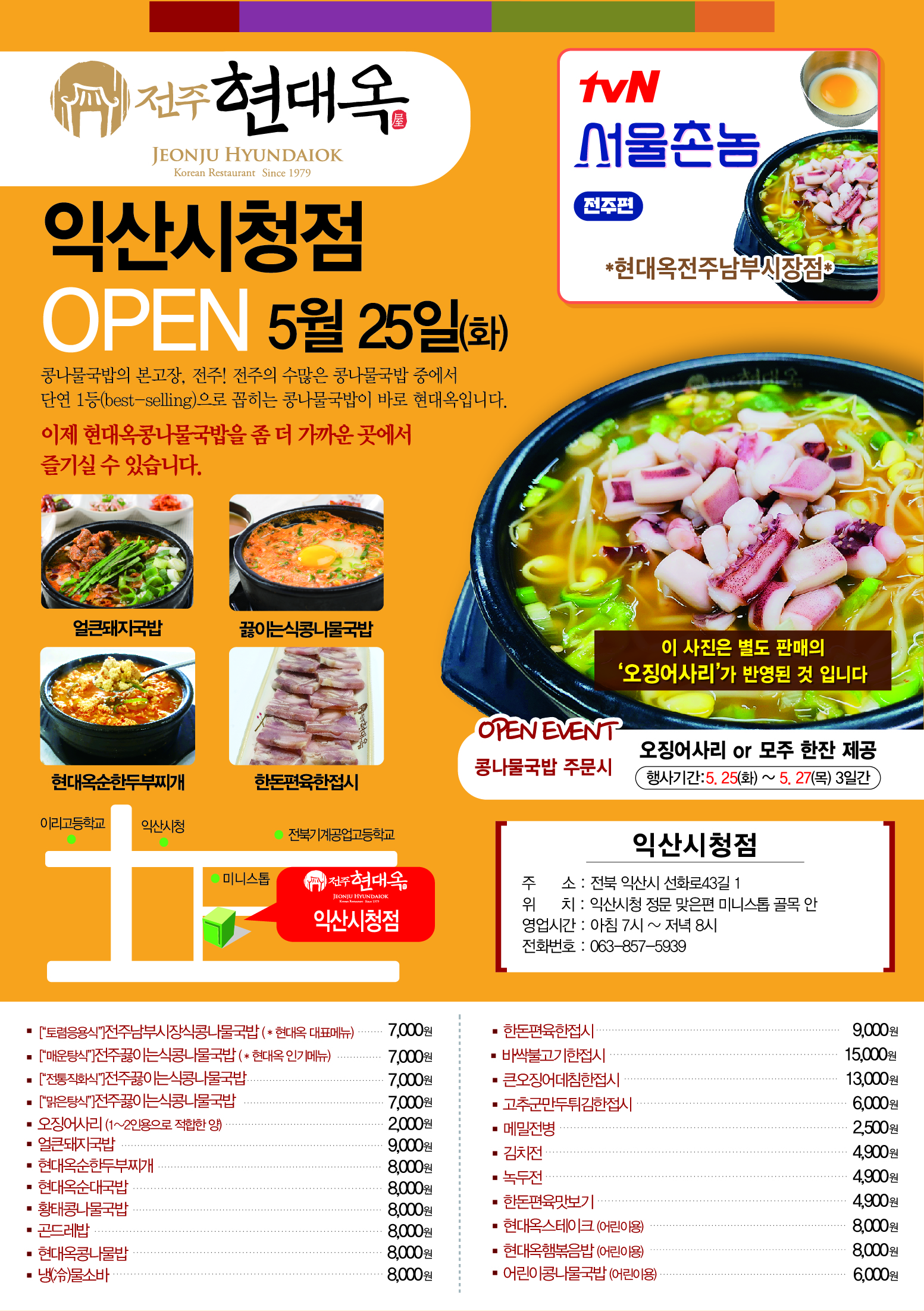 오늘자 전북 익산시 남중동 소재 익산시청 인근에 현대옥 익산시청점이 오픈하였습니다.