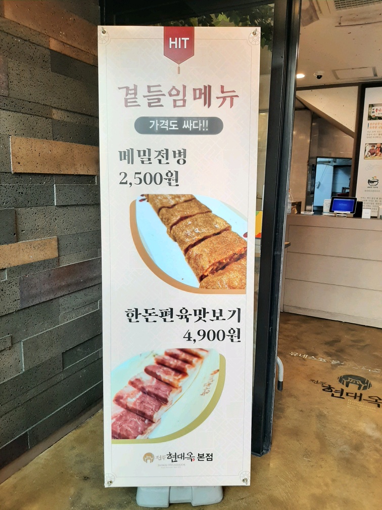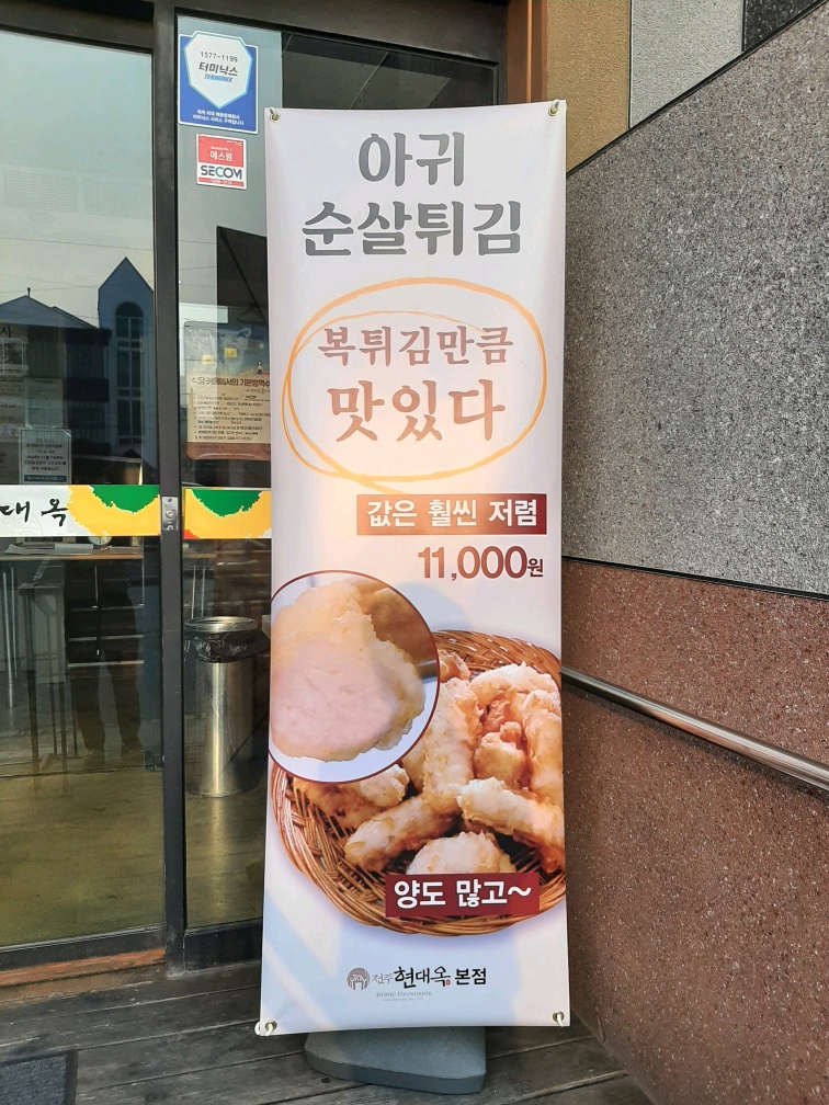 현대옥본점에서는 '아귀순살튀김'에 대하여 매출 증대를 꾀하면서 본점은 물론 전국 현대옥가맹점들에서 오징어튀김에 버금가는 주요 메뉴로 자리 잡고자 하면서 "복튀김만큼 맛있다."의 카피를 내거는 POP를 개발하고, 본점 현관 입구에 X-배너 비치하고 있습니다. 현대옥본점에서는 아귀순살튀김 배너에 더하여 메밀전병과 한돈편육맛보기에 대한 X-배너도 비치하고 있는데, 앞으로 주요 메뉴들에 대하여 판매 촉진은 물론 메뉴 홍보를 강화하는 차원에서 메뉴별로 일정 기간 X-배너를 순환 비치할 계획입니다. 이러한 지속적인 홍보 활동들을 통하여 해당 메뉴들에 대하여 인식이 강화됨으로써 각 가맹점에서는 매장매출은 물론 배달매출의 증대로도 연결될 것으로 기대합니다. 아래에 두 개의 X-배너 사진을 첨부해 놓습니다.