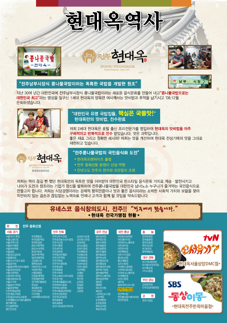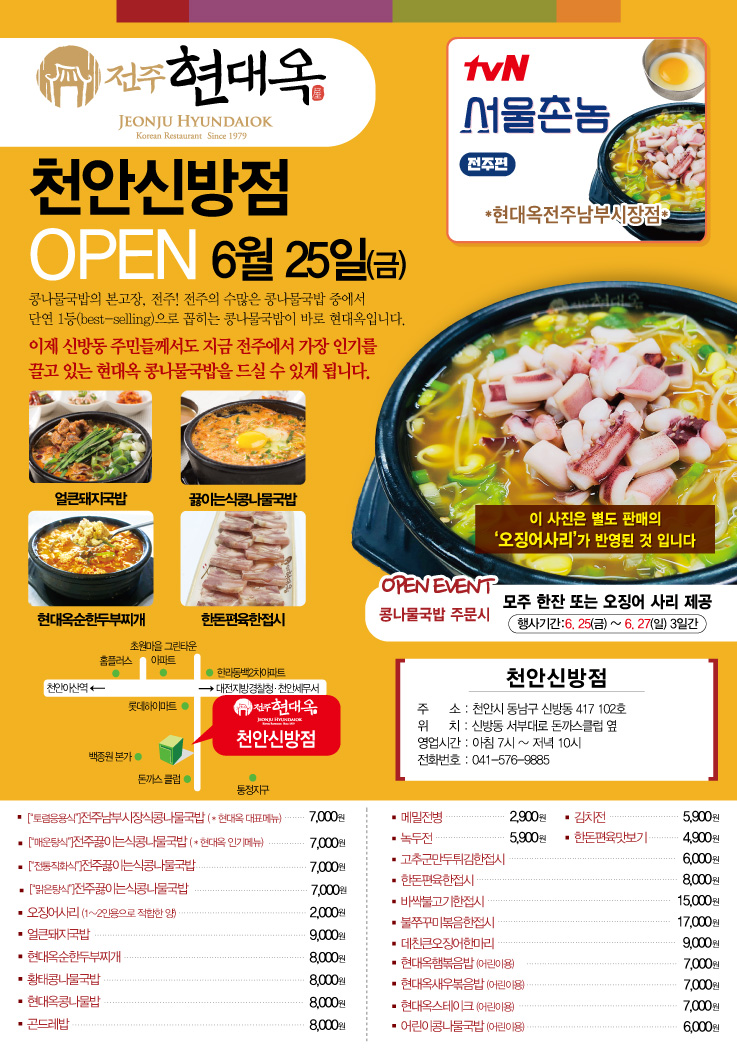 오늘 천안시 동남구 신방동에 현대옥이 오픈하였습니다. 금번 오픈하는 천안신방점은 전주중화산동 소재 '현대옥본점'의 서빙로봇 카페부스 등 여러 시스템과 메뉴들을 상당 부분 접목하는 가맹점입니다. 금번 천안신방점이 크게 성공하여 규모나 시스템 그리고 메뉴들에서 현대옥본점의 타입이 전국 각지에 확산되는 계기가 되기를 바라고 있습니다. 이를 위하여 천안신방점은 맛 관리와 친절 등에서 특별히 철저할 것이기도 합니다. 천안신방점은 오픈 분위기를 조속히 안정화 시키고 얼마 전 새로 출시한 배달 메뉴들도 본격 판매하게 될 것입니다.천안신방점은 배달 메뉴들의 적극 취급을 위해서 저장공간으로서 냉장냉동 시설들을 충분히 준비했습니다. 아래에 천안신방점의 오픈전단지 앞뒷면을 첨부해 놓습니다.