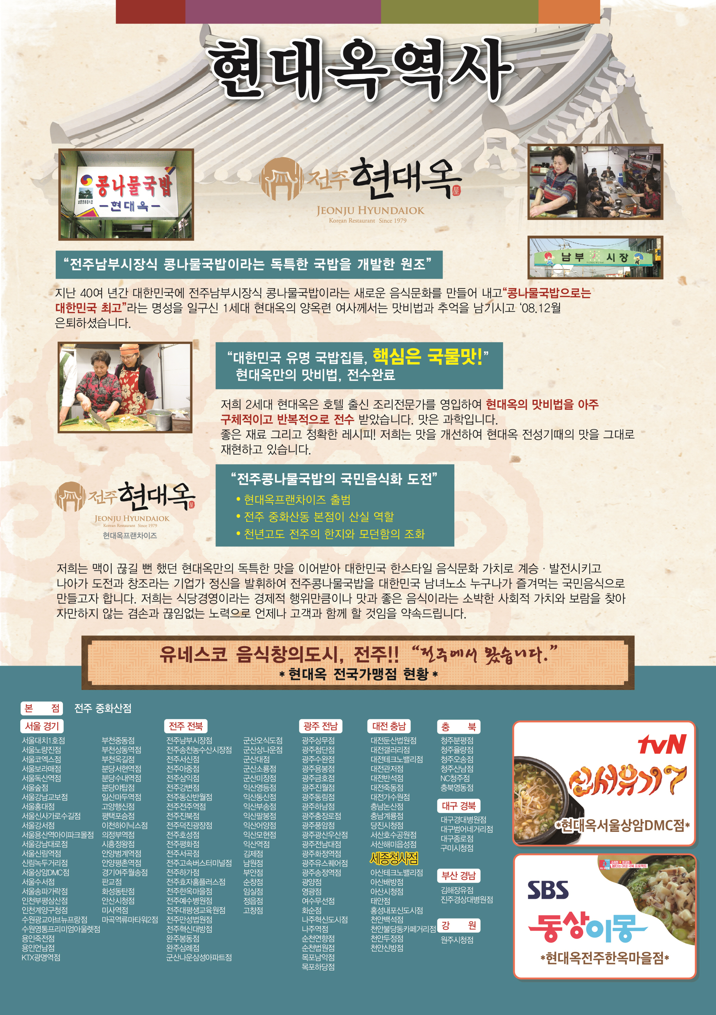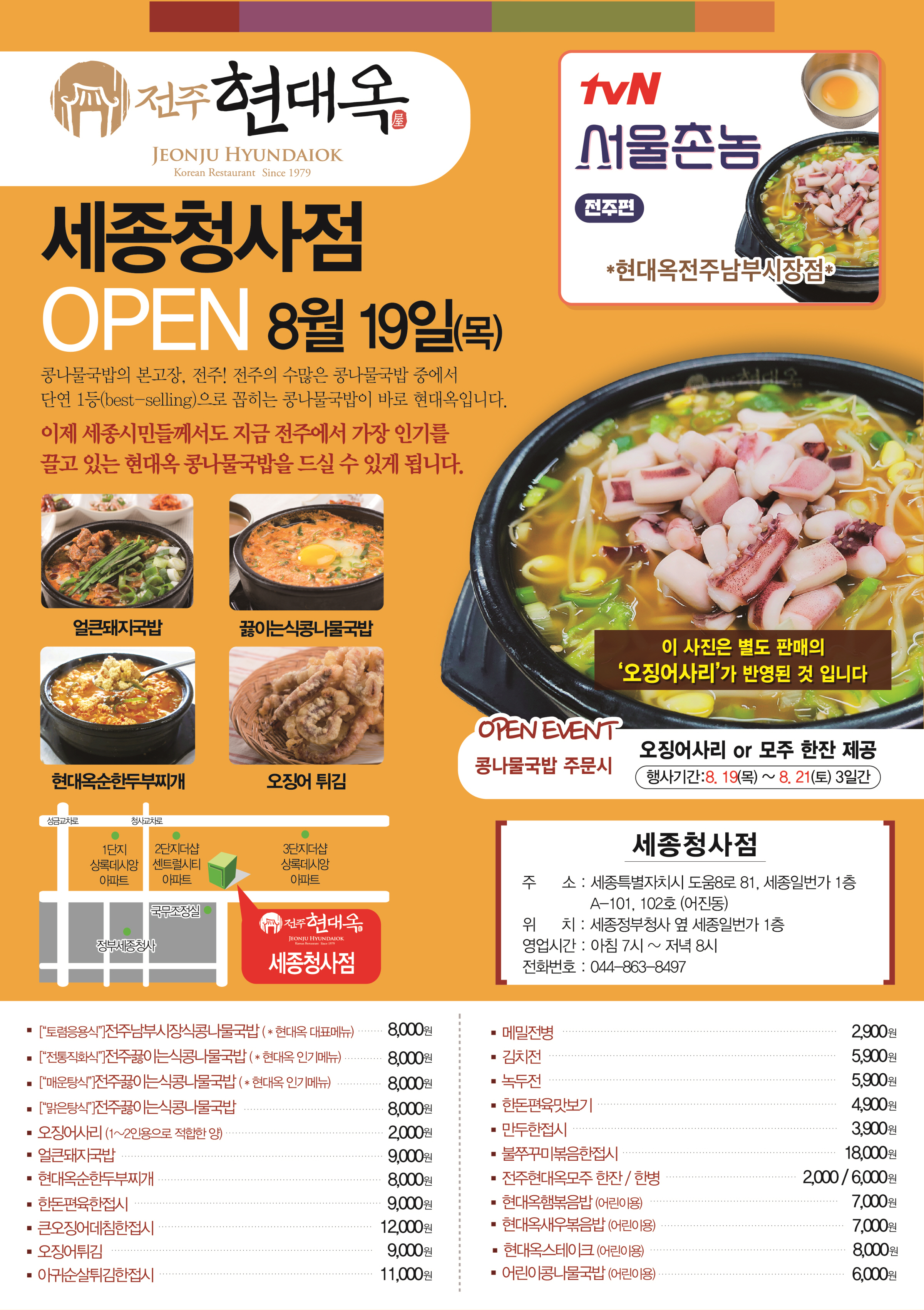 정부세종청사 중앙부처 소속기관 공무원들과 인근 직장인 및 주민들께서는 이제 "전주에서 온 전주콩나물국밥, 현대옥"을 가까운 곳에서 즐기실 수 있게 됐습니다.