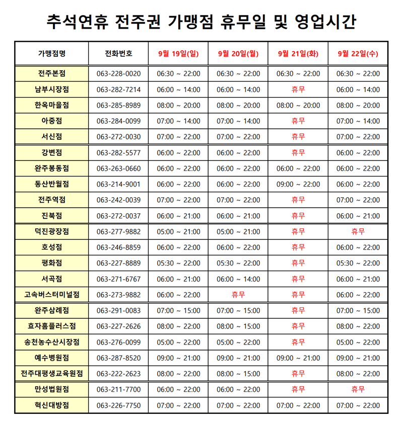전주권 이외 지역 가맹점의 영업시간은 해당 가맹점에 전화 문의하셔야 합니다.