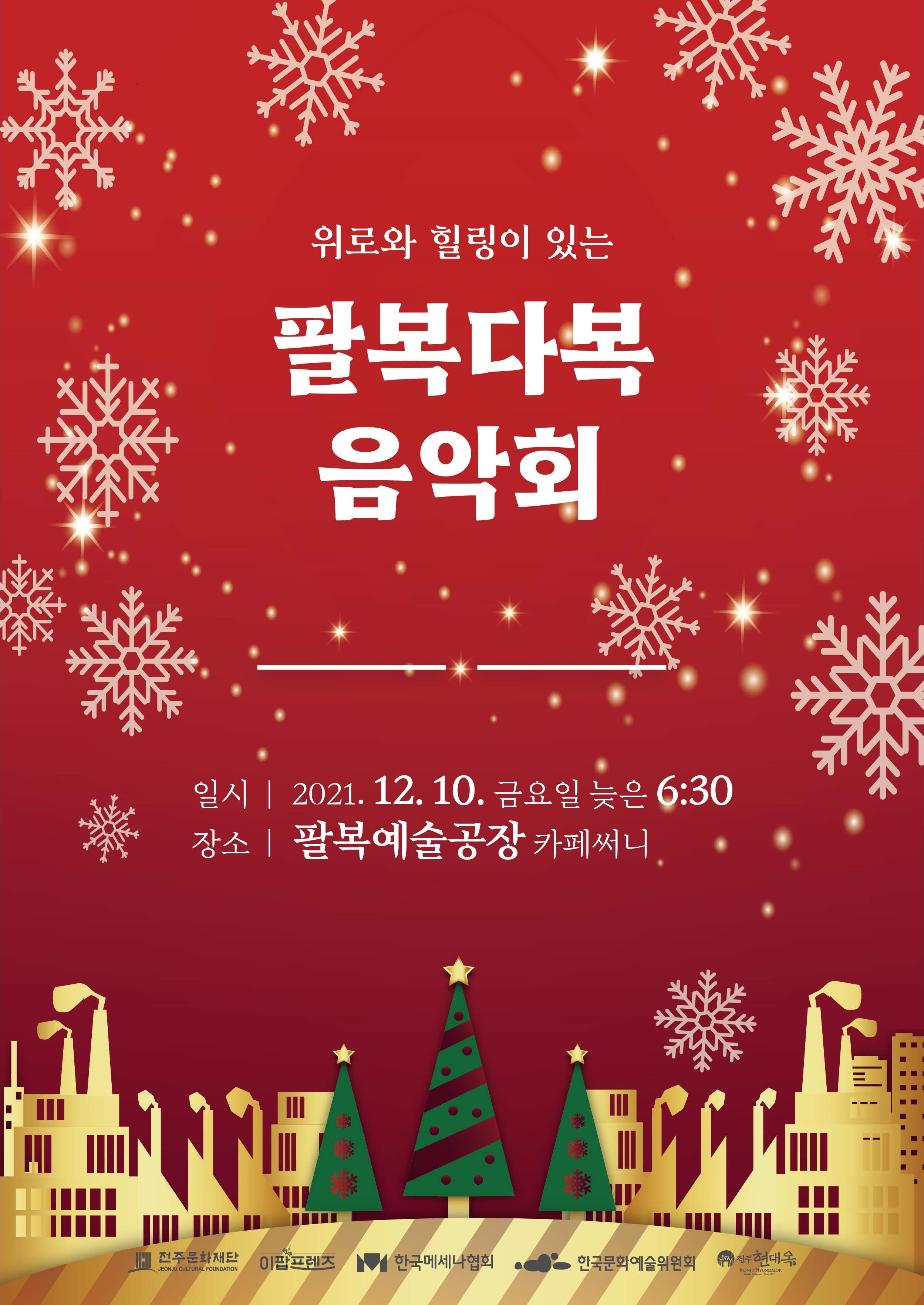 현대옥가맹본부는 지난 7월 전주문화재단에 중소기업의 예술 지원 차원에서 1천만 원을 지원한 바 있습니다. 그 지원금은 전주시에서 활동하고 있는 예술가들에게 작품활동 지원비로 사용됩니다. 이번 주 금요일(12/10) 저녁 6:30 전주시 덕진구 소재 '팔복예술공장'에서 '팔복다복음악회'가 개최되는데, 그 음악행사의 한 프로그램으로서 예술가들께 지원금 전달식이 진행됩니다. 현대옥은 전주전북지역에서 문화예술체육 및 사회 부문에 꾸준히 사회공헌활동을 펼쳐 왔는데, 이러함들은 전주시민 및 전북도민들께 현대옥에 대한 좋은 이미지를 심어 주어 전주전북 지역 가맹점들의 영업력에 도움이 된다라고 생각합니다. 아래에 금번 음악회 관련 포스터를 첨부해 놓습니다.