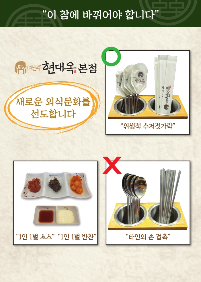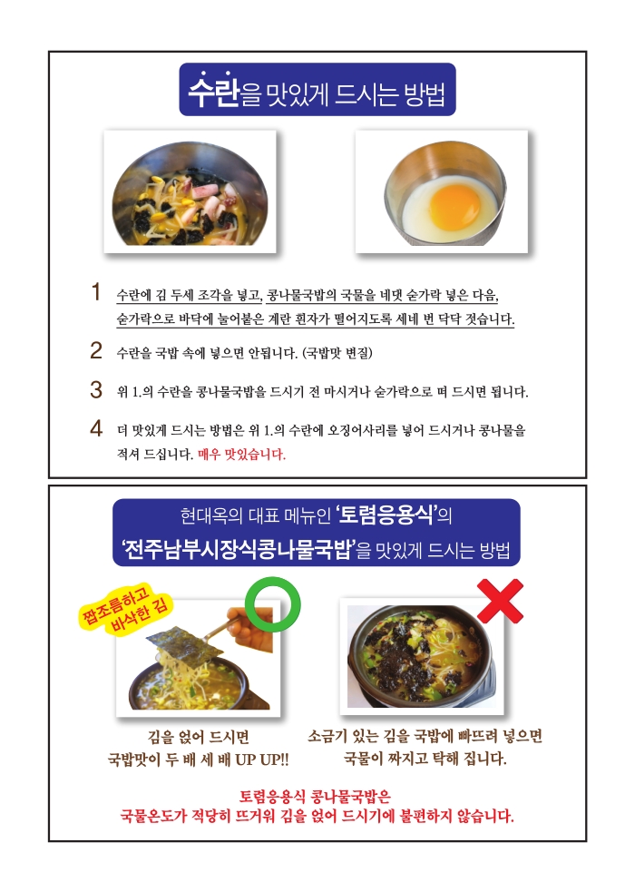 현대옥본점에서는 지난 9월 말부터 매장의 각 테이블에 '수란 맛있게 먹는 방법'과 '현대옥콩나물국밥 맛있게 먹는 방법'의 A4사이즈 양면 인쇄물을 비치해 왔고, 2층 고객대기실 내 각 테이블에도 동일한 안내문을 비치해 왔습니다. 많은 고객들께서 이 안내문을 통하여 수란의 맛을 새롭게 알게 되고, 김을 얹어 먹는 콩나물국밥의 색다른 맛을 접하게 되었는데, 매우 유효한 안내문이다라고 자평합니다. 현대옥본점에서는 이에 더하여 '위생적 수저젓가락 제공' 등에 대한 새로운 안내를 추가하여 다시 한번 고객들의 마음을 사로 잡고자 합니다. 현대옥은 끊임없이 변화하고 도전합니다. 금번에 추가하는 내용은 작금 코로나 상황에서 현대옥본점이 현대옥가맹점들과 전국의 식당들을 향하여 "이 참에 바뀌어야 합니다."를 외치면서 '비접촉'의 '새로운 외식 문화'를 제시하는 것입니다. 현대옥본점은 2009년 개점하였는데, 그 이후 반찬 용기의 변화와 반찬양 적게 담기 등 실로 많은 부분에서 새로운 외식문화를 선도해 왔습니다. 이번에는 '위생적 수저젓가락 제공'과 '1인1벌 반찬 제공' 등을 선도하고자 하면서 현대옥본점에서 기 실행해 왔던 이러한 부분들에 대하여 인쇄물을 통하여 고객들과 세상에 적극 노출시키고자 합니다. 금번 새로운 안내문은 A4사이즈 양면 인쇄물로서 한면에는 '수란과 콩나물국밥 맛있게 먹는 방법'을 담고 있고, 다른 면에는 '이 참에 바뀌어야 한다. 위생적 수저젓가락 제공' 등을 담고 있습니다. 이 인쇄물은 현대옥본점 매장 내 각 테이블 마다에 코팅 인쇄물로 비치하며, 2층 고객대기실 각 테이블 마다에 비치된 메뉴북에는 삽지해 놓습니다. 현대옥가맹본부에서는 전국 현대옥가맹점들에도 금번 새로운 안내문 비치 및 실천을 적극 권장할 것입니다. 전국 현대옥가맹점들이 각 지역에서 새로운 외식문화 선도의 첨병 역할을 맡음으로써 "우리동네 1등식당, 현대옥"의 위상은 한단계씩 쌓여 올려지리라 봅니다. 아래에 새로운 안내문을 첨부해 놓습니다. <안내문 앞/뒷면> <앞면>