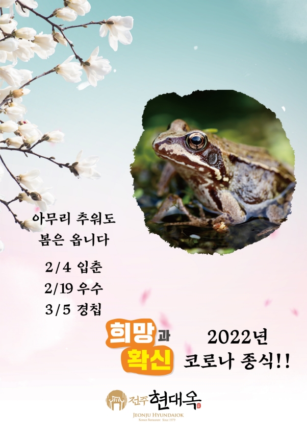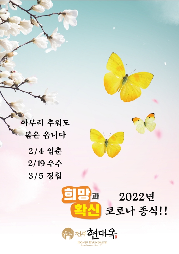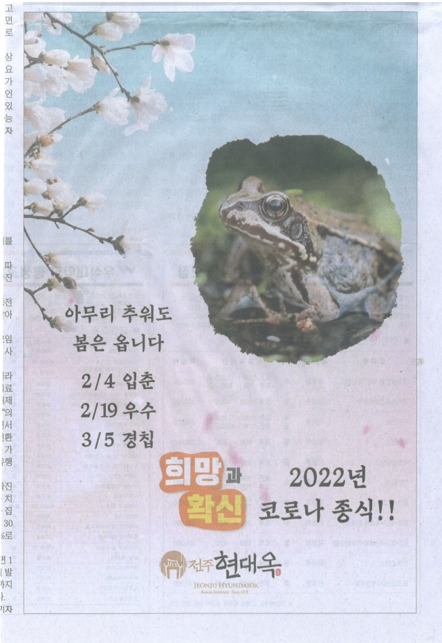 현대옥 고객들이신 전북도민들과 코로나 종식의 염원을 함께 나누고자 하는 내용으로 신문광고를 실시합니다. 광고 사양은 A4사이즈 세로형 칼라색상이며, 광고 디자인은 두 버전으로 하여 두 버전이 지그재그 각 2회씩 총 4회 게제됩니다. 광고 개시는 다음 주 월요일자부터 시작되며, 광고 게제면은 열독률이 높은 1~3면으로 합니다. 광고 매체는 전북의 대표 지방지인 전북일보입니다. 작금 추위와 코로나에 지쳐 있는 도민들께 "따뜻한 봄은 오고, 2022년 금년 말 이내에는 코로나가 종식될 것임"의 희망과 확신을 갖자는 이미지 광고입니다. 금번 광고를 접하는 도민들께서는 "격조있는 현대옥, 도민과 공감을 나누는 현대옥"의 우호적 인식을 한층 더 갖게 될 것인데, 이로써 전북 지역 내 40여 가맹점들의 영업력에 도움이 되기를 기대합니다. 현대옥가맹본부는 그간 전북 지역 내에서 꾸준히 광고를 집행해 왔는데, 전북권 현대옥가맹점들의 높은 영업력은 타지역 현대옥가맹점들에도 좋은 영향을 미친다고 봅니다. 아래에 광고디자인 두 버전을 첨부해 놓습니다. P.S. 금번 신문광고는 2월 8일자부터 전북지역 10여 개 지방신문사로 확대하여 실시하고 있습니다.