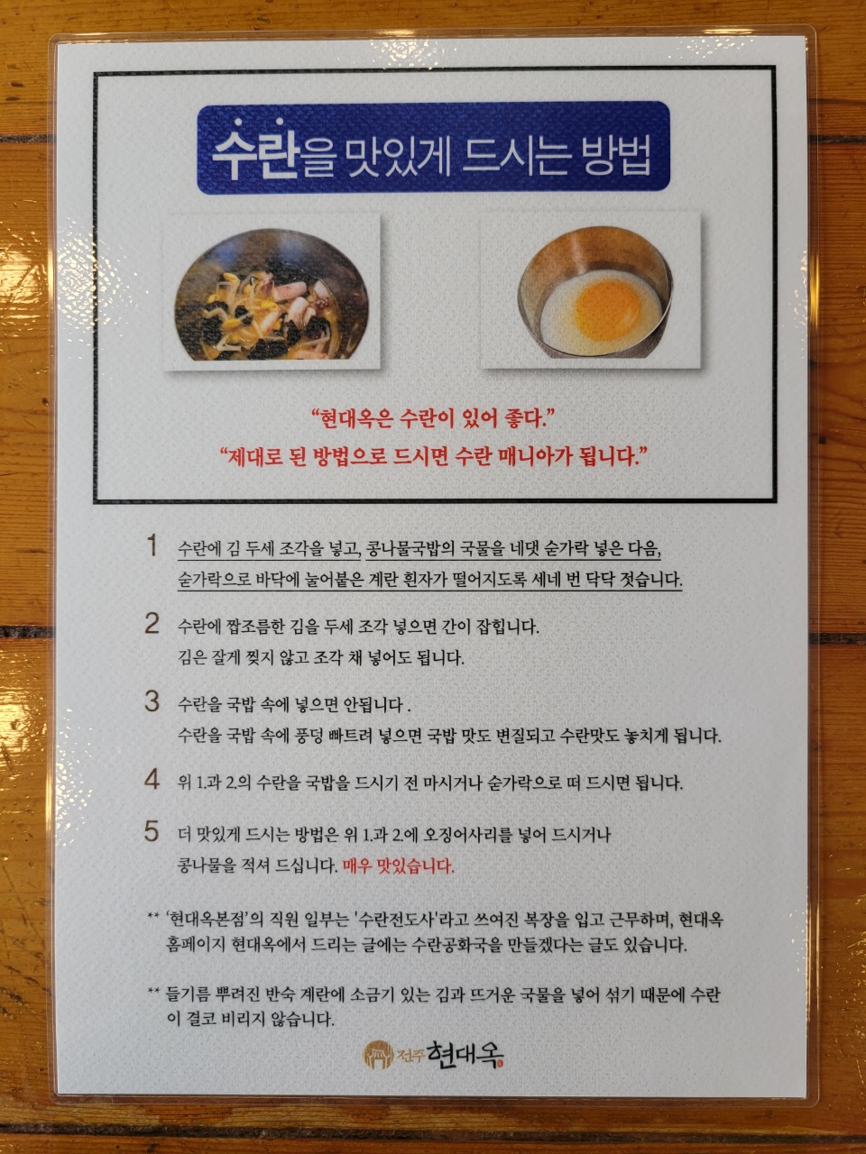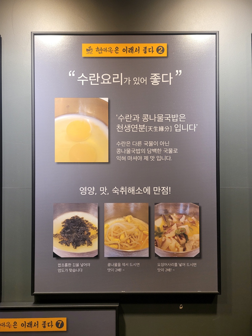 현대옥가맹본부는 수란을 통하여 경쟁적 콩나물국밥식당들과의 차별화를 강화하여 전국 현대옥가맹점들의 영업력을 한층 끌어 올리기 위하여 수란의 맛을 개선 보강하고자 합니다. 현대옥가맹본부에서는 이미 10여 년전부터 "현대옥은 수란이 있어 좋다."를 내세우면서 매장 벽부착물과 메뉴북 그리고 현대옥박물관 등을 통하여 수란을 적극 부각시켜 왔습니다. 본점 홀근무 직원들 일부는 "나는 수란전도사입니다. 수란을 맛있게 드시는 방법을 알려 드립니다."의 수란전도사 복장을 입고 근무하고 있는 터이며, 현대옥홈페이지 내 '현대옥생각'에서는 '수란전도사'라는 글을 통하여 수란공화국을 만들어 내겠다는 포부도 밝힌 바 있습니다. 이러한 일련의 노력들이 쌓여 현대옥본점 및 가맹점들의 영업력을 이루고 있다할 것입니다. 현대옥의 여러 노력에 힘 입어 현대옥가맹사업 10여 년이 지나면서 많은 국민들께서는 수란의 맛을 알게 되었고, 많은 국민들께서는 수란매니아가 돼 가고 있다고 봅니다. 수란에 맑은 콩나물국밥국물을 몇 숟가락 넣고 짭조름한 현대옥김을 넣어 숟가락으로 저어 간을 맞춘 다음, 여기에 오징어사리와 콩나물을 섞어 먹는 맛은 그 자체로서 하나의 요리가 됩니다. 후라이나 스크럼블 또는 삶은 계란 등 수 많은 계란 요리 중 단연 으뜸은 '현대옥식 수란 요리'입니다. 제대로 된 수란맛을 접하게 되면 십중팔구 여지없이 수란매니아가 되는 것입니다. 그런데 아직도 제대로 된 수란맛을 접하지 못한 국민들이 상당수 있다고 판단하면서 현대옥가맹본부에서는 '현대옥식 수란'의 확산에 가일층 노력을 기울이기로 하였습니다. 본점 및 일선 가맹점 차원에서 노력의 핵심은 세 가지입니다. 첫째는 수란 맛 향상으로서 수란에 넣는 들기름 등의 양을 지금 보다 두 세배 이상 늘려서 고소한 맛을 크게 올리고, 둘째는 콩나물국밥이 아닌 다른 국밥을 드시면서 수란을 별도 추가하는 경우 수란에 '콩나물국밥국물'을 충분히 부어 제공하는 것이며, 셋째는 각 테이블에 "수란 맛있게 드시는 방법'의 안내문을 적극 비치하는 것입니다. 현대옥가맹본부에서는 수란의 고소한 맛을 올리기 위하여 들기름 등의 투입량을 크게 올리거나 또는 깨소금이나 잣가루 등의 투입을 통하여 수란 맛 향상을 곧바로 추진할 것입니다. 이다음 몇 년 뒤 "현대옥 그들이 있어 대한민국 국민들 모두가 '현대옥식 수란'에 푹 빠져 있다." 그리고 "우리 다음 세대에서 현대옥 그들이 있어 우리나라 가정 집집 마다 수란을 만들어 먹는다."의 수란공화국이 된 세상을 상상해 봅니다. 상상 속에서 콩나물아이스크림이 태어 났습니다. 이다음 그 언젠가는 뉴욕 도쿄 파리에서도 '현대옥식 수란'의 계란 요리가 일반화된 세상을 상상해 봅니다. 아래에 현대옥박물관과 매장 벽부착물 등으로 노출시키고 있는 "현대옥 수란이 있어 좋다."의 POP와 테이블에 비치하고 있는 '수란 맛있게 드시는 방법'의 안내문을 첨부해 놓습니다.