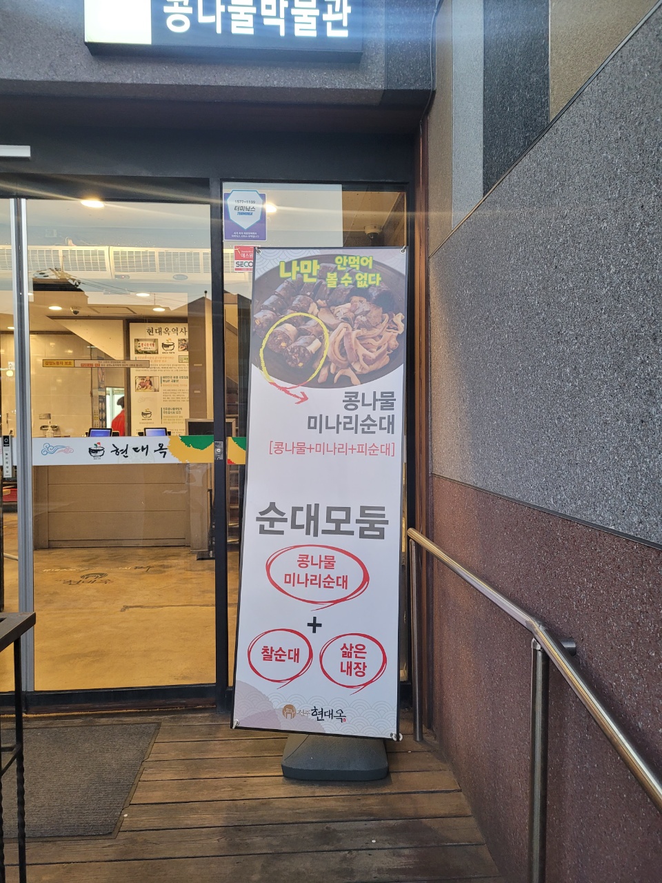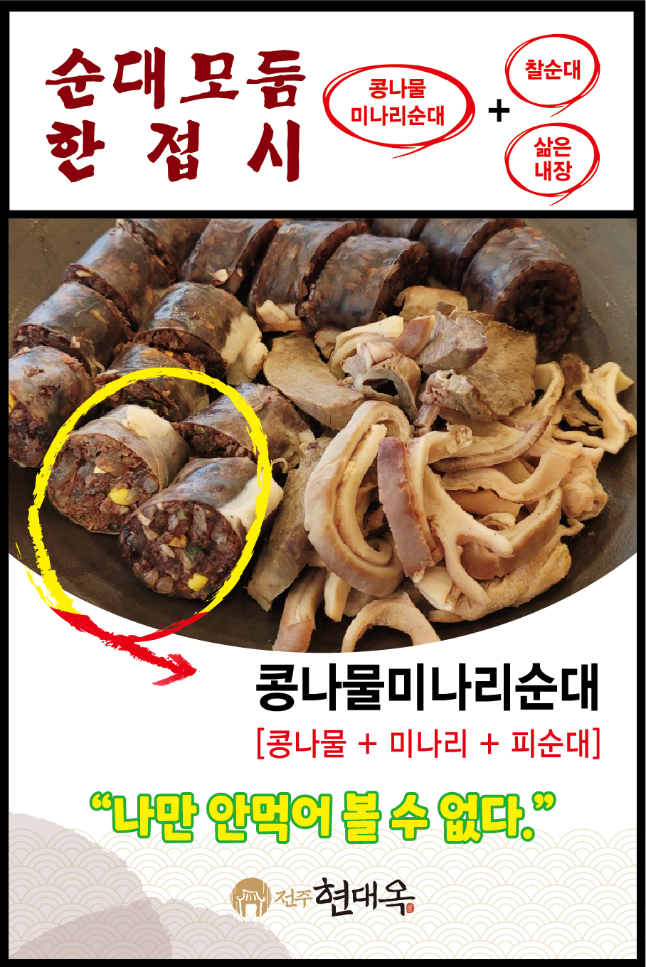 지난 3월 중순부터 판촉해 오던 순대모둠한접시의 구성을 오늘부터 변경합니다. 기존에는 콩나물미나리피순대와 찰순대의 두 가지를 절반씩 구성하였는데, 여기에 오소리감투 염통 등의 삶은내장을 추가하여 각 1/3씩으로 구성합니다. 한편 콩나물미나리피순대에 있어 콩나물과 미나리 함량을 큰 폭 증가시켜 콩나물과 미나리 풍미를 크게 향상시킨 제품으로 교체 사용하게 됩니다. 이렇게 품질을 개선하면서 판매가는 동일하게 책정함으로써 기존 순대모둠한접시를 애용하던 고객들의 만족도 올라 가게 될 것이어서 순대모둠한접시 자체의 매출도 증가되고 이 메뉴를 통한 매장 전체 매출의 견인도 기대합니다. 완성도를 높인 순대모둠한접시를 전국 가맹점에서도 적극 판매하도록 독려해 나가겠습니다. 아래에 본점출입구 비치의 X-배너와 본점 실내벽 부착의 POP를 첨부해 놓습니다. <X-배너 디자인>