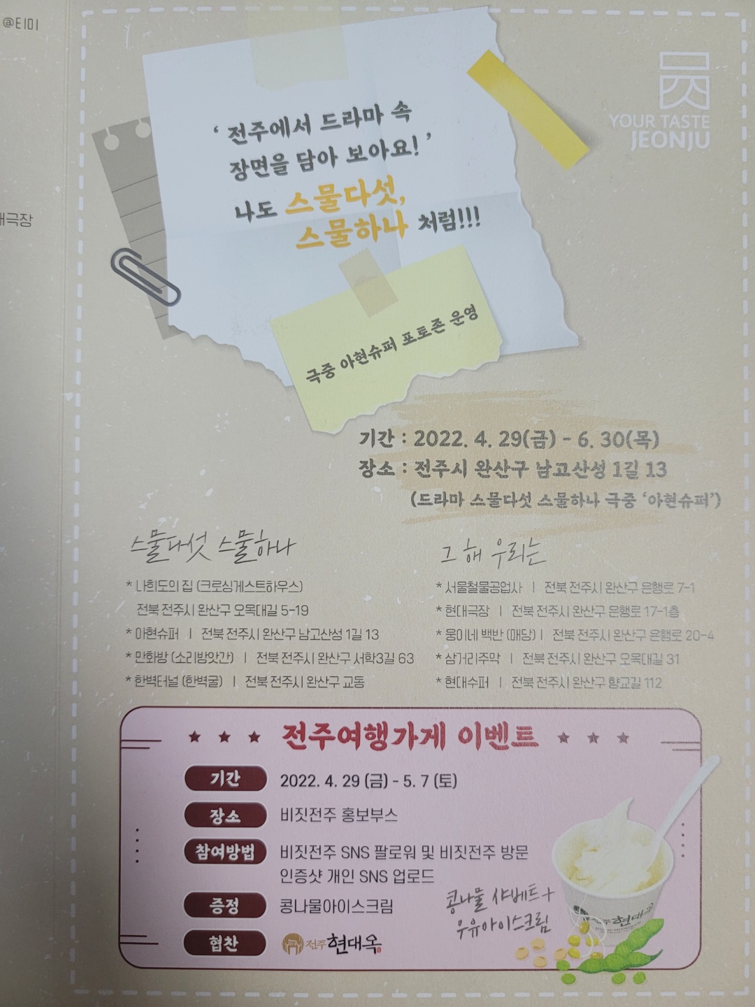 한편 금번 설치의 '비짓전주 부스'에서는 80~90년대의 레트로 감성 분위기의 종이뽑기, 고무신 체험하기, 롤릿돌리기 등의 재미있는 이벤트 행사들을 진행하게 되는데 이벤트 참여자들에게는 현대옥이 협찬한 '콩나물향 3단계의 콩나물아이스크림'을 증정하게 됩니다. 아이스크림 컵은 현대옥로고가 새겨 진 것입니다.