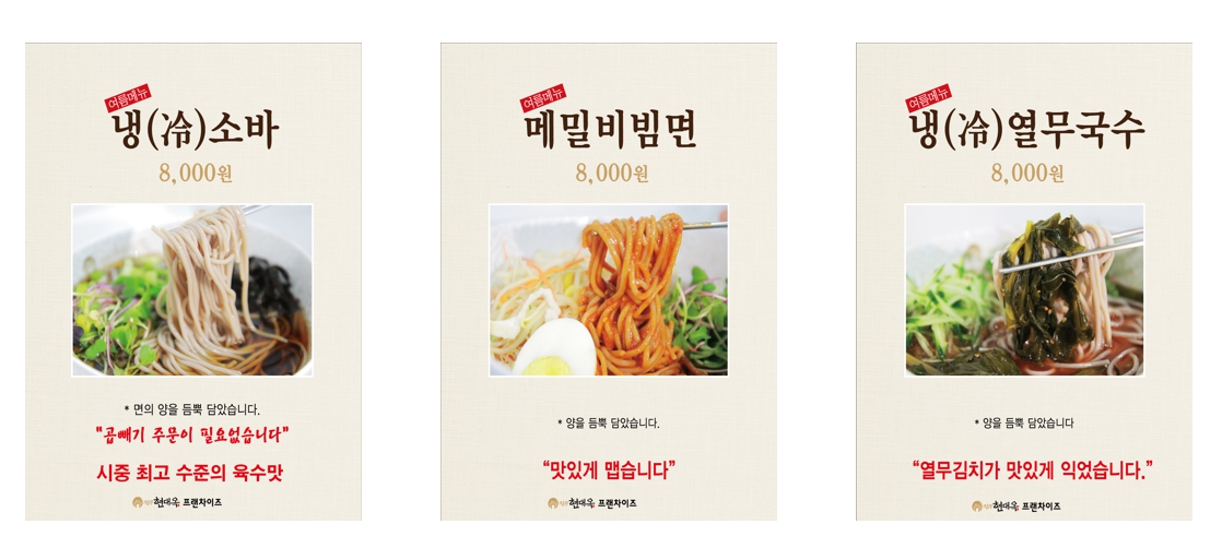 여름 메뉴 판매 여부와 판매품목은 가맹점별 자율입니다. 본점에서는 이와 같은 메뉴들은 판매하지 않고 기존 메뉴들 중 곤드레밥과 콩나물밥을 여름 적합 메뉴로 특정하여 현관 X-배너와 실내 행어로서 POP 게시하면서 판매 촉진하고 있습니다.