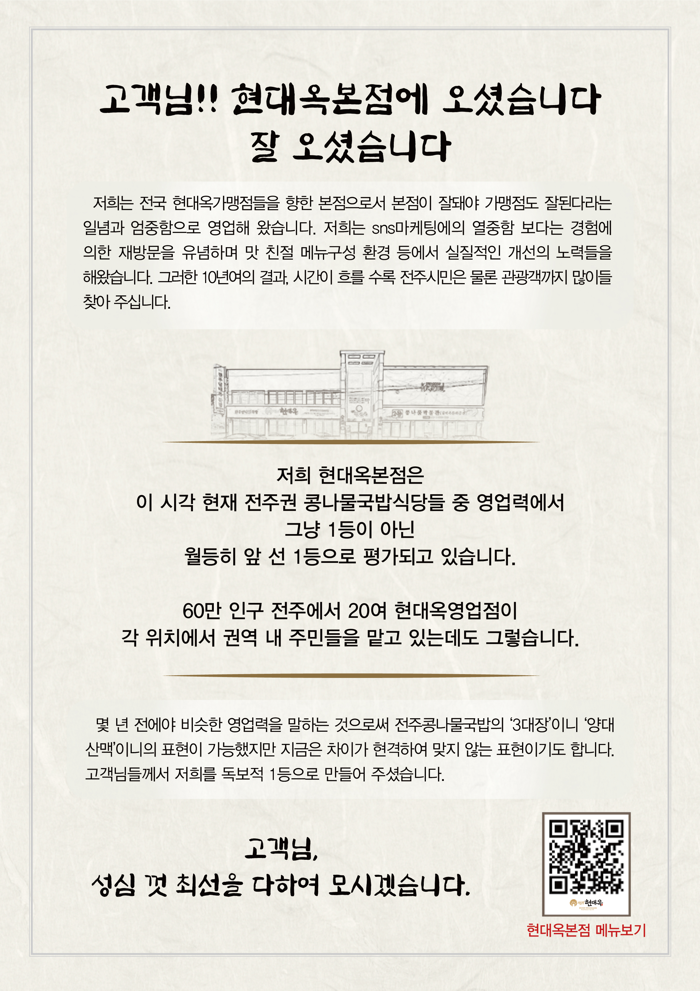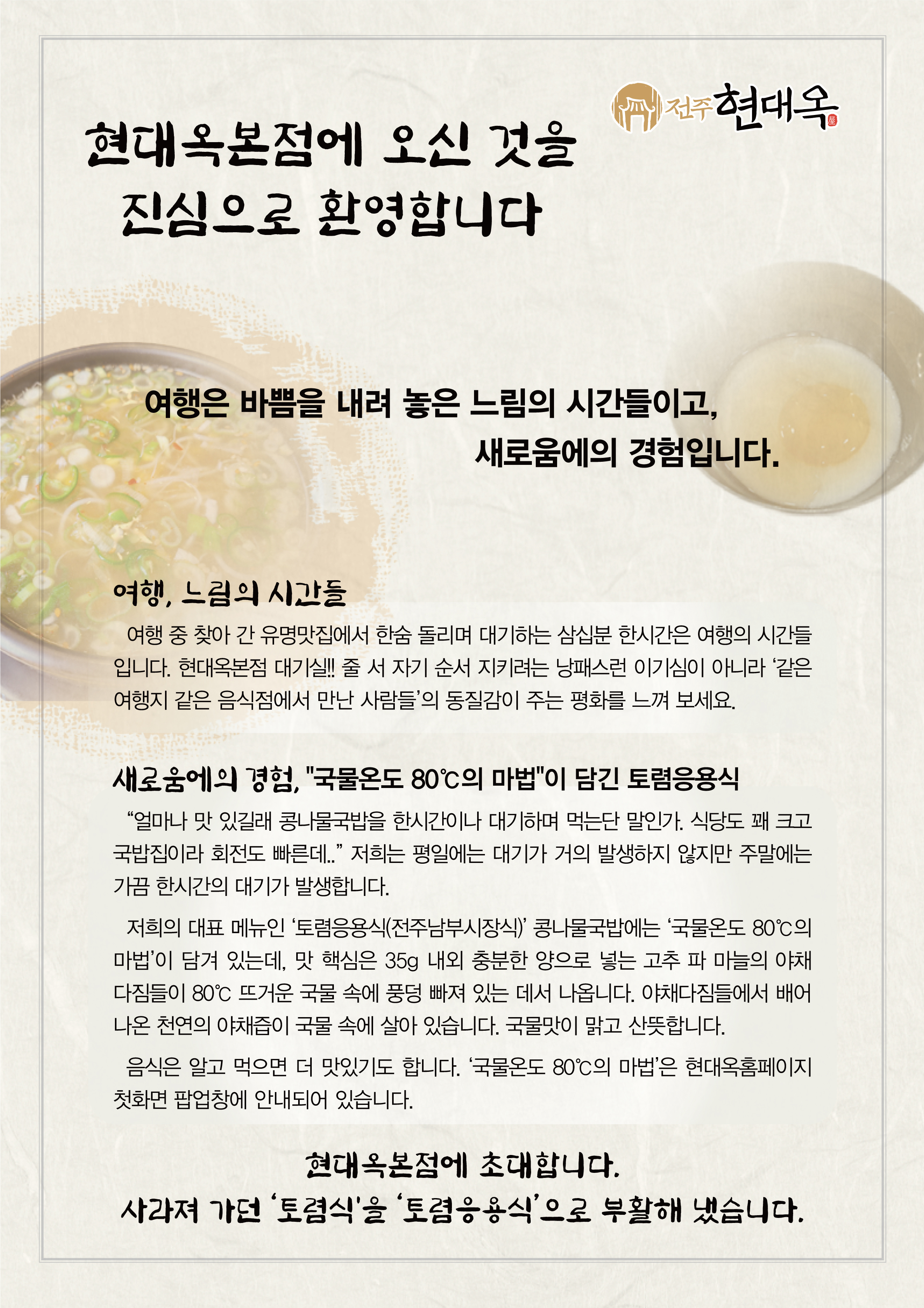 "얼마나 맛있길래 콩나물국밥을 한시간이나 대기하고 먹는단 말인가. 규모가 큰 대형식당이고 국밥집이라 회전도 빠른데.." 전주중화산동 소재 현대옥본점은 평일에는 대기가 거의 발생하지 않는데, 주말 점심시간대에는 대기가 상당합니다. 대략 대기 초반에는 10분 정도이다가 피크타임대에는 한시간 정도이고 끝부근에서는 다시 10여 분으로 단축됩니다. 본점에서는 대기 고객들이 뙤약볕 아래 줄 서 다리 아프며 대기하는 불편을 없애고자 몇 년전부터 의자 비치와 냉난방 가동의 대기실을 운용하고 있습니다. 대기실의 각 탁자에는 메뉴북과 여러 홍보물들을 비치하고 있습니다. 전주 여행 차 현대옥본점에 들렀다가 대기하는 경우, 콩나물박물관과 홍보물들을 통하여 현대옥의 이모저모를 알게 됩니다. 본점은 이러함을 통하여 전국 각지 현대옥가맹점들의 영업력을 지원하고 있기도 합니다. 이번주부터는 새로운 홍보물로 대체 비치합니다. 새로운 홍보물은 A4크기 양면 인쇄물로서 각 탁자 위에 비치하는 메뉴북에 삽지해 놓습니다. 금번 새로운 홍보물을 아래에 첨부해 놓습니다. <새로운 홍보물 디자인>