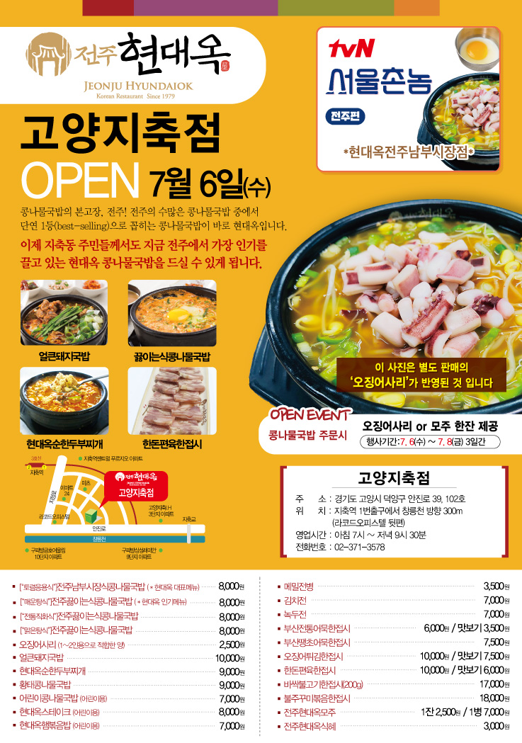 오늘자 경기도 고양시 덕양구 지축역 인근에 현대옥 고양지축점이 오픈하였습니다. 지축역 인근의 직장인들과 주민들께서도 이제 "전주에서 온 전주콩나물국밥, 현대옥"을 가까운 곳에서 즐기실 수 있게 됐습니다.