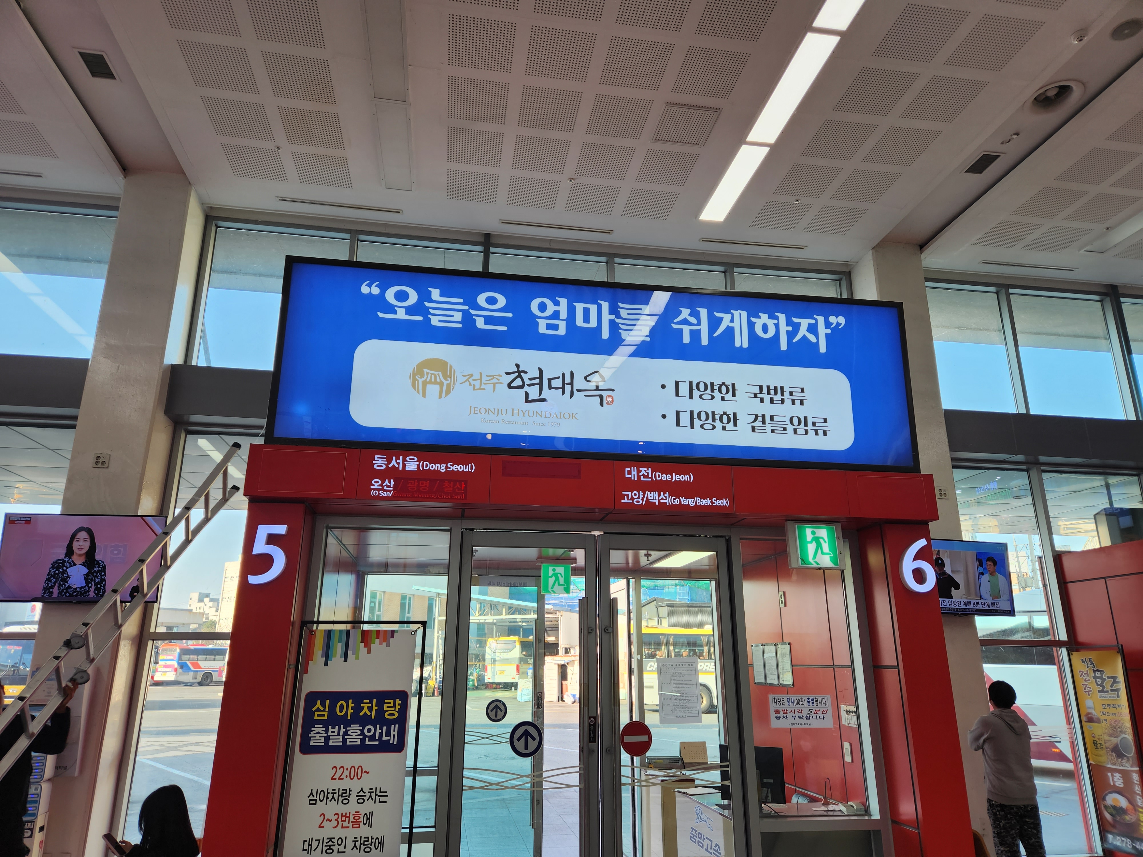 오늘부터 전주고속버스터미널 대합실의 전광판에 현대옥광고가 시작 되었습니다. 전주발 동서울 고양 대전 등의 탑승장 출구 상단에 게첨되어 있습니다. 이 출구 옆에는 서울강남 광주 대구 등의 탑승장 출구가 있기 때문에 합동 대합실에 앉아 기다리는 여행객들은 목적지에 상관없이 현대옥 광고를 볼 수 있습니다. 금번 광고 문구의 핵심은 "오늘은 엄마를 쉬게하자" 입니다.