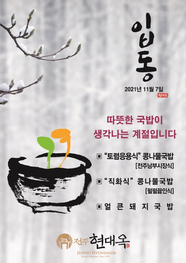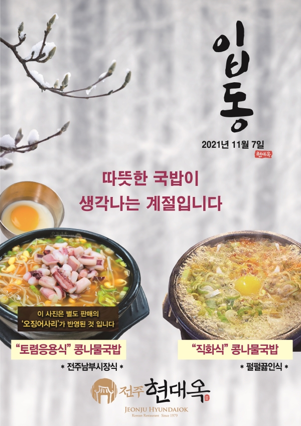 오는 11월 7일이 입동입니다. 입동을 맞아 "따뜻한 국밥이 생각나는 계절입니다."의 이미지 광고를 전북일보 전북도민일보 새전북신문 전라일보 등 4개 일간지에 실시합니다. 광고는 내일부터 시작하여 다음 주까지 각 언론사 형편에 맞추어 게제됩니다. 금번 광고를 통하여 전주전북 소재 현대옥가맹점들은 지역 주민들께 '입동 인사'를 하는 것인데 가맹점 영업력에 일정 도움될 것으로 기대합니다. 전주 소재 현대옥본점과 전주권 가맹점들의 왕성한 영업력은 결국 전북의 여타 시군 및 전북 이외 타지 소재 현대옥가맹점들의 영업력에도 파급적 효과를 미친다고 봅니다. 이러한 차원에서 그간 전주전북지역에 꾸준히 이미지광고를 해왔고, 앞으로도 그렇게 할 것이기도 합니다. 광고디자인은 두 가지 타입으로 하였고, A4사이즈 세로형 칼라입니다. 각 신문사에서는 신문의 2면과 3면으로 하여 두 가지 모두를 교차하여 합 3회 게제합니다. 아래에 광고디자인을 첨부해 놓습니다.