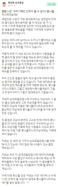 현대옥가맹본부에서는 현대옥의 정체성에 잘 부합되면서 맛과 고객반응 등이 잘 어우러진 '순대모둠한접시'를 현대옥을 대표하는 또 하나의 주력 곁들임메뉴로 만들어 놓고자 합니다. 네이버 다음 구글 등의 포털-현대옥본점-'소식' 코너에 '콩나물미나리피순대'를 널리 알리는 글을 일제히 띄웠습니다. 이에 더하여 각 포털 속 현대옥본점의 메뉴에서도 '순대모둠한접시'에 대한 메뉴 설명을 보강하였습니다. 이러함들의 결실로서 전국 현대옥가맹점들에서 순대모둠한접시가 가맹점 매출을 견인하는 주력 곁들임메뉴가 되어 있기를 기대합니다. 아래에 '네이버'의 현대옥본점 소식에 띄운 알림을 캡쳐하여 첨부해 놓습니다.