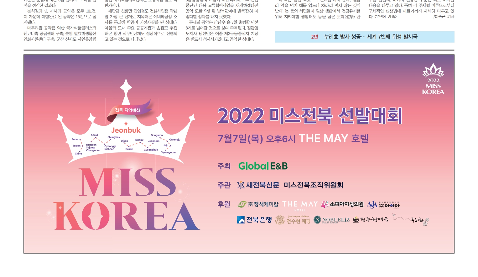 미스코리아 선발대회에 출전할 전북대표를 뽑는 '미스전북 선발대회'가 오는 7월 7일(목) 저녁 6시 전주더메이호텔에서 개최됩니다. 이 대회는 새전북신문이 주최하는데, 현대옥은 작년재작년에 이어 금년에도 협찬 참여합니다.