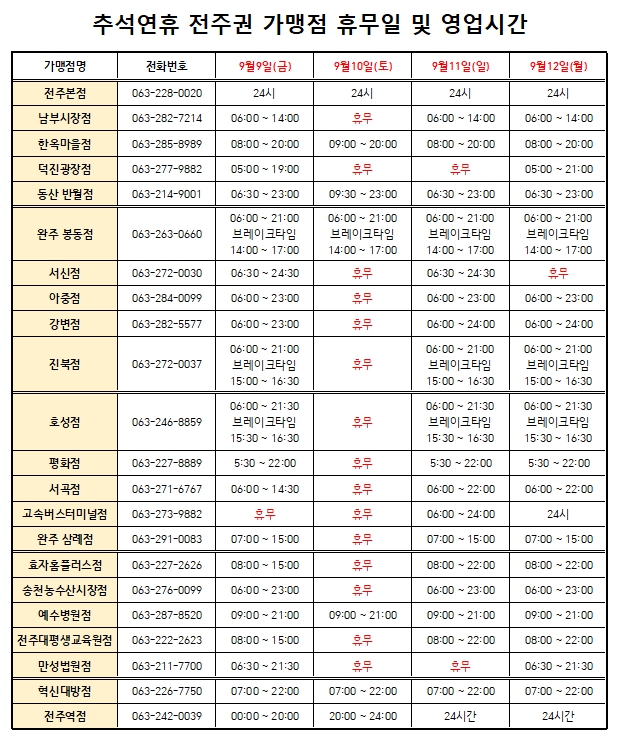 전주권 이외 지역 가맹점의 영업시간은 해당 가맹점에 전화 문의하셔야 합니다.