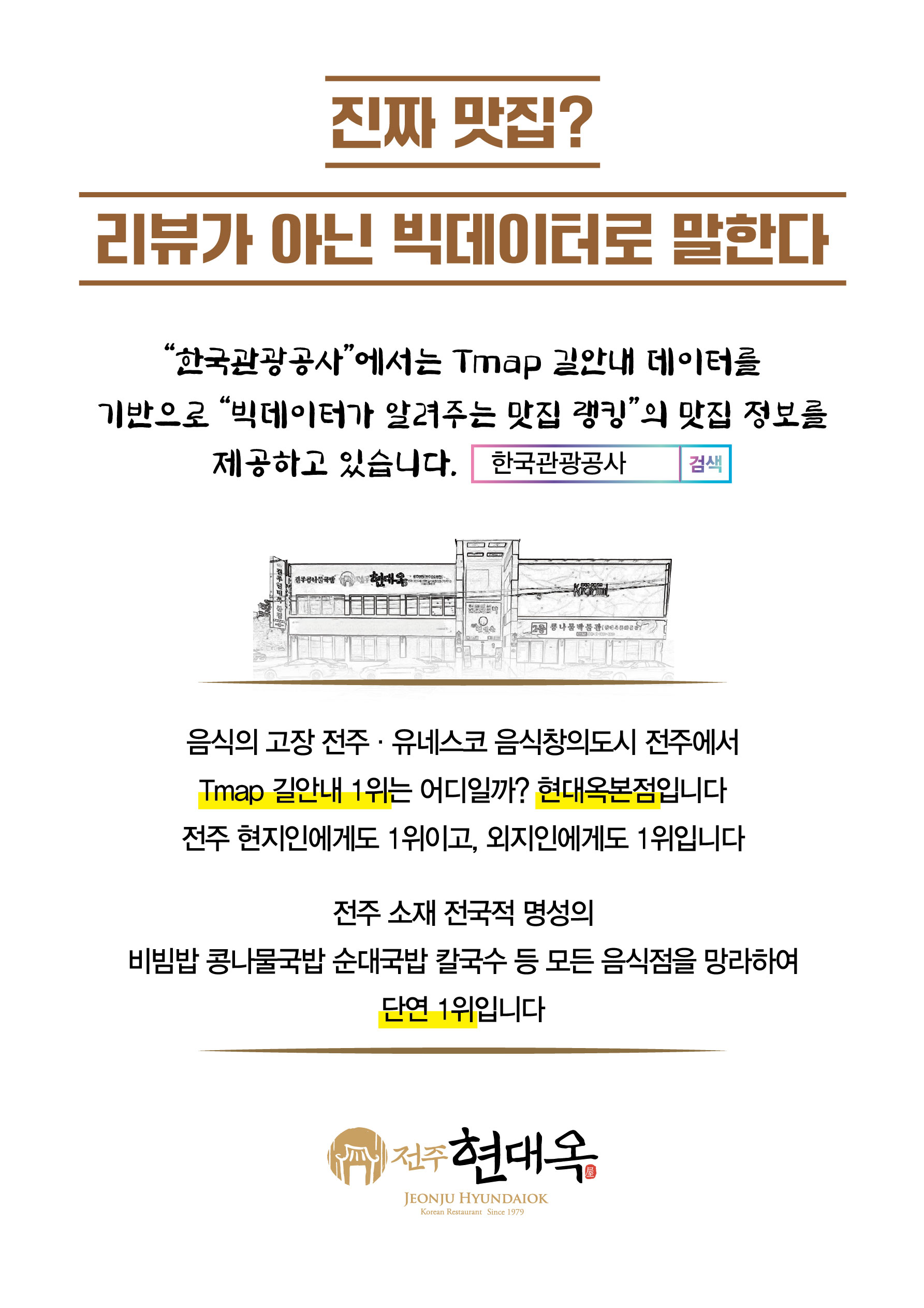 현대옥본점은 시간이 갈 수록 전주시민과 전북도민은 물론 관광객들까지 많이들 찾는 '명소'로 부각되어 있습니다. '명소'라는 근거는 '현대옥본점이 전주 소재 전국적 명성의 비빔밥 콩나물국밥 순대국밥 칼국수 등의 모든 음식점을 망라하여 Tmap 길안내 횟수 1위'라는 빅데이터입니다.
