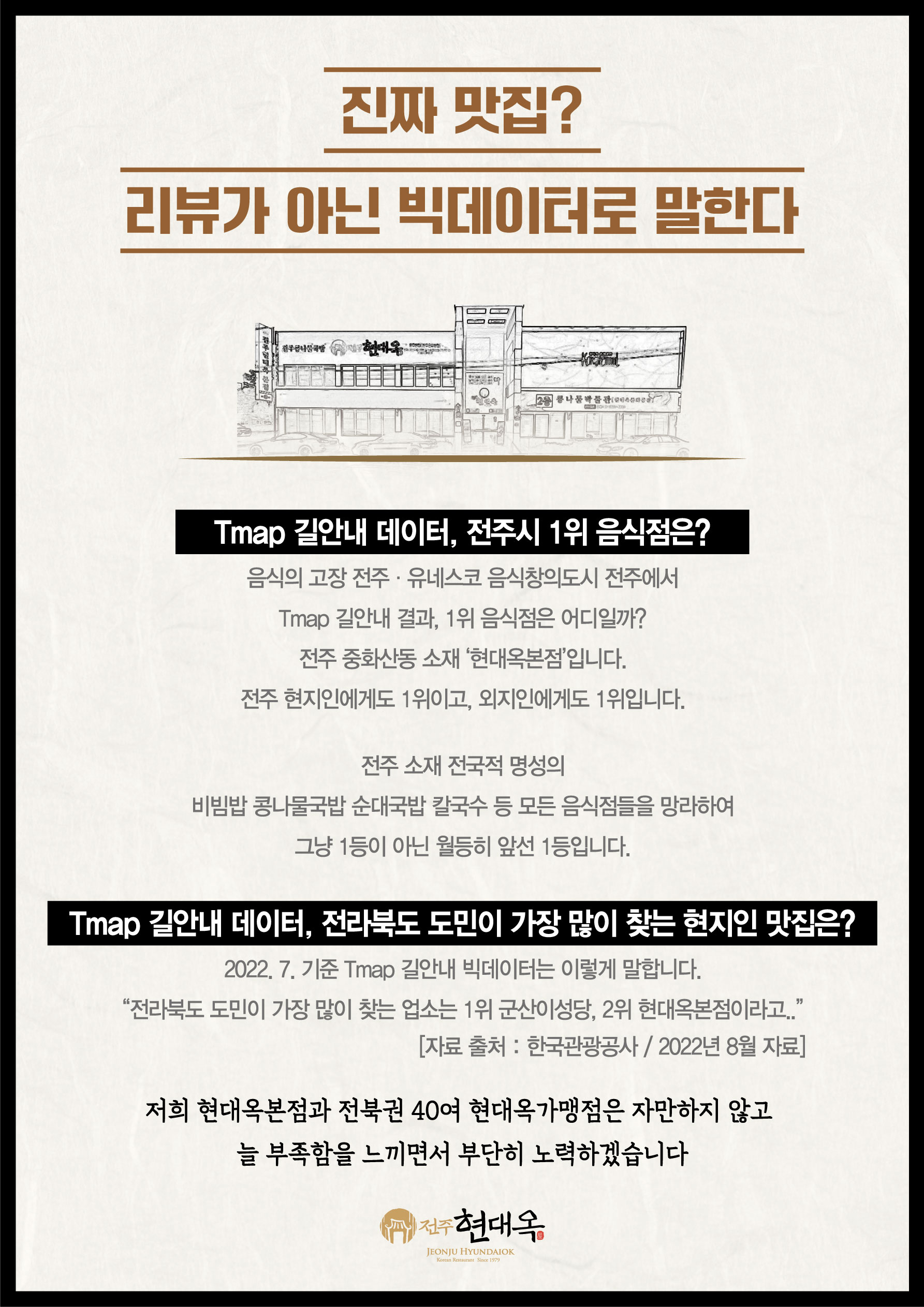아래 신문광고 내용 중 '전북도민이 가장 많이 찾는 현지인 맛집'에서 현대옥본점이 2위인 것은 2022. 7. 기준이며, 2022. 8. 기준으로는 4위임. 따라서 신문광고 내용도 이를 반영하여 수정할 것임