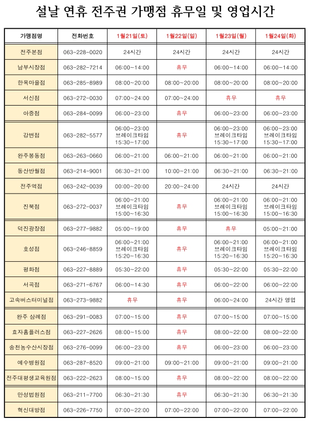 전주권 이외 지역 가맹점의 영업시간은 해당 가맹점에 전화 문의하셔야 합니다.