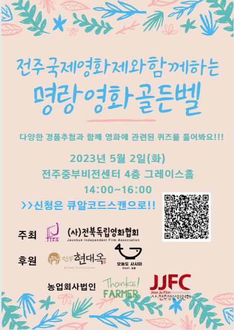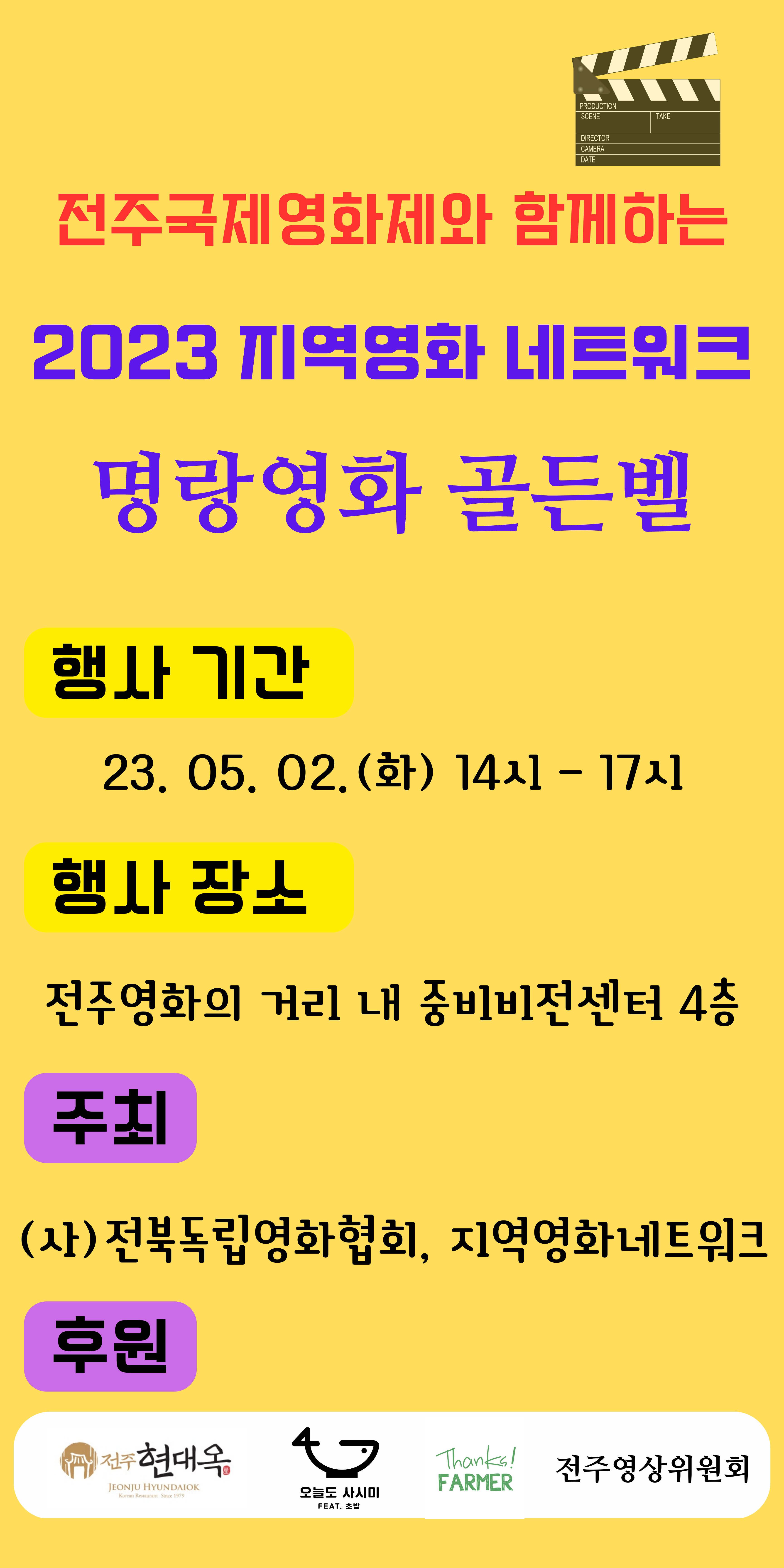 제24회 전주국제영화제가 4월 27일(목)~5월 6일(토)간 전주에서 개최됩니다. (사)전북독립영화협회에서는 이 영화제와 함께하는 행사로서 '명랑영화 골든벨' 행사를 5월 2일(화) 14:00~16:00 전주중부비전센타에서 개최하는데, 저희 현대옥이 후원 참여합니다.