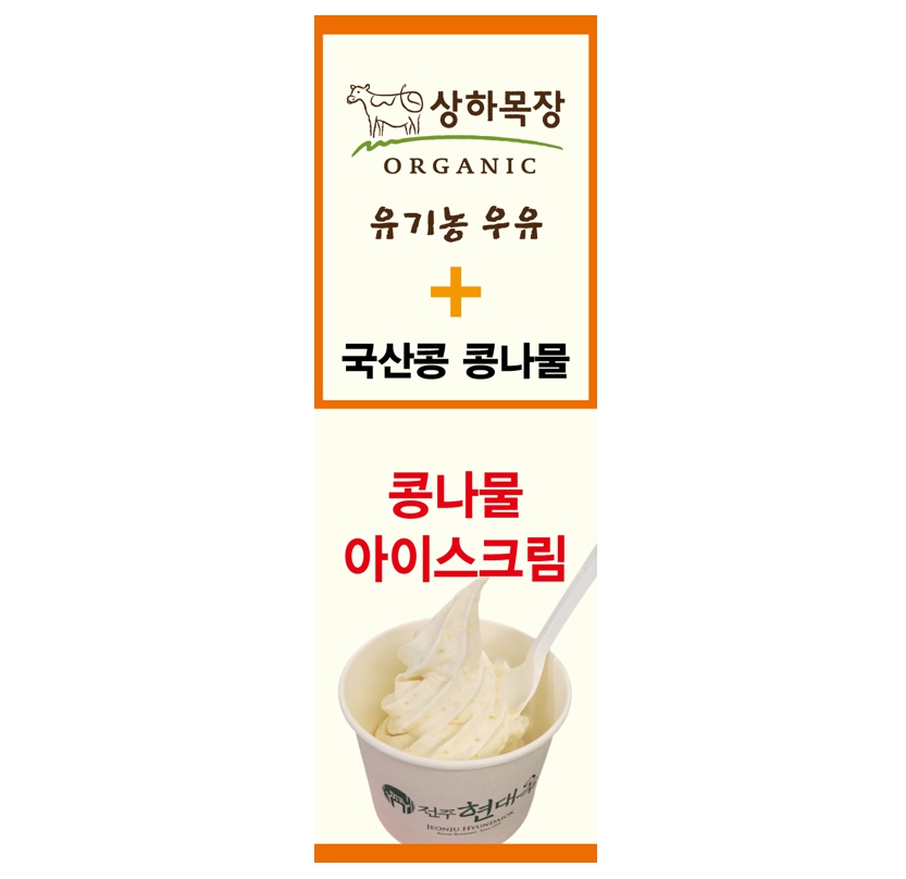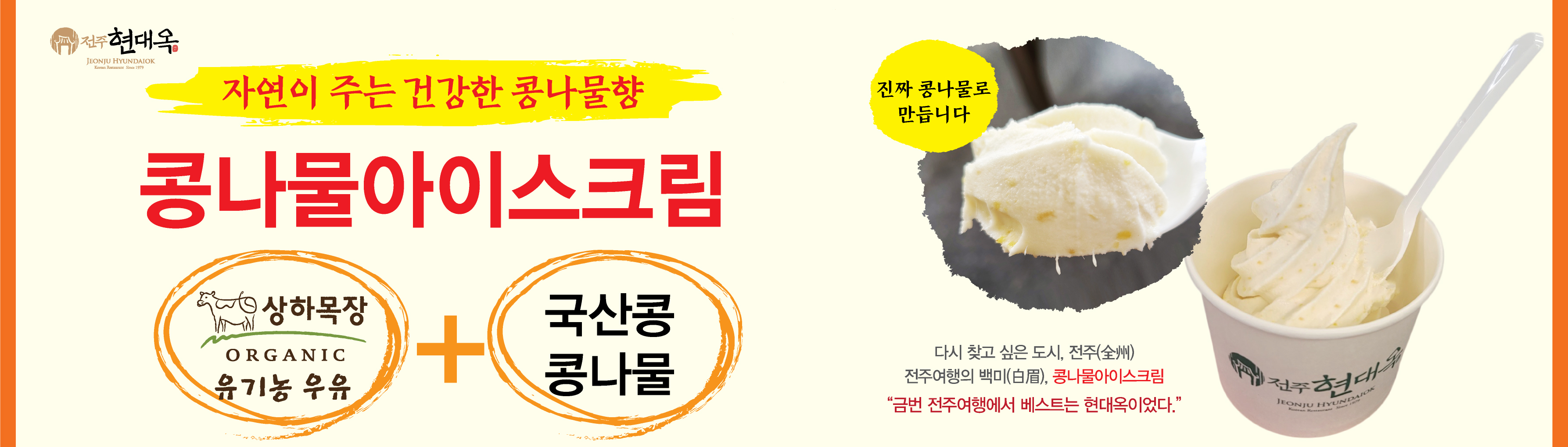 2년 전 출시한 콩나물아이스크림에 대하여 그 동안의 고객 평가와 제안 등을 반영하여 개선 작업에 착수하였는데, 최근 그 작업을 완료하고 개선된 새로운 콩나물아이스크림을 어제 2023. 6. 27.자부터 판매 개시하였음을 알립니다. 금번 개선의 핵심은 두 가지입니다. 하나는 맛 개선으로서 우리나라 프리미엄 우유인 ‘상하목장 유기농 우유’를 사용함으로써 고급 우유아이스크림이 갖는 부드러움의 풍미를 크게 올렸습니다. 콩나물아이스크림의 맛은 콩나물샤벳의 아삭함과 상큼함 그리고 우유아이스크림의 부드러움과 고소함이 합쳐진 맛입니다. 그런데 그간은 콩나물샤벳의 맛이 강하여 콩나물비린맛이 좀 더 지배적 맛이었고, 이로써 호불호가 갈리는 요인이기도 했었습니다. 금번 맛 개선에서는 이 부분을 적극 보완 개선하였는데, 출시한 어제부터 벌써 고객 평가가 달라지고 있습니다. 다른 하나는 그 간 약한맛 중간맛 강한맛의 3가지로 판매하던 것을 ‘약한맛’과 ‘강한맛’의 두 가지로 단순화하였습니다. 약한맛 강한맛의 구분은 콩나물비린맛인 ‘콩나물 향’의 강도 차이입니다. 생선비린내는 역하고 오래 가지만, 콩나물비린내는 자연이 주는 건강한 향입니다. 그간 2년간 경험에 의한 매니아 고객들은 금번 개선된 맛에 있어서도 여지없이 강한맛을 선호합니다. 저희는 콩나물아이스크림을 오래 전부터 현대옥의 ‘보배’로 인식해 왔었습니다. 그런데 일부 부족함이 있던 터여서 언젠가는 개선하여 현대옥의 명물은 물론 전주 여행의 명물로 만들어 놓고자함을 한시도 놓지 않았는데, 금번 진보된 결과를 세상에 내놓게 됐습니다. 저희는 금번 프로젝트를 추진함에 있어 마케팅 전문업체에 용역 의뢰하여 우리나라 유명 아이스크림과 비교 평가하면서 개선 방향을 찾았고, 금번 개선에 적극 반영하였습니다. 금번 함께한 마케팅 업체에서는 다음 주부터 금번 맛 개선된 콩나물아이스크림에 대하여 블로그리뷰와 인스타그램 등을 통하여 적극 홍보할 것입니다. 금번 함께 참여한 마케팅 업체의 전국적 조사에 따르면, 저희의 콩나물아이스크림이 맛과 양 등에서 다른 유명 아이스크림에 비하여 결코 뒤지지 않는데, 가격은 상당히 저렴한 것으로 나타났었습니다. 저희는 품질경쟁력과 가격경쟁력 두 가지 모두를 갖추어 현대옥과 전주 여행의 명물로 만들어 놓고자 하면서 금번에 가격을 동결합니다. 저희는 콩나물의 고장 전주시의 현지인들께는 자긍심을 주고 전주 여행객들께는 호기심과 기대감을 충족시켜 주고자 하면서 콩나물아이스크림, 콩나물박물관, 콩나물머릿핀, 콩나물볼펜, 네 종류의 콩나물국밥 등의 ‘콩나물 세상’을 만들어 오고 있습니다. 저희는 ‘콩나물빵’도 개발을 완료하였고, 특허청 등록도 마쳤는데, 적절한 시기에 세상에 내놓겠습니다. 전주시에는 현대옥본점 포함 20여 현대옥이 각 위치에서 평균 영업년수 10년으로 영업하면서 전주시를 ‘콩나물국밥으로 행복한 도시’로 일구어 왔습니다. 자본주의 시장경제는 경쟁을 통하여 산업의 발전과 제품의 진보가 이루어 지고, 그 이익은 소비자 만족으로 연결됩니다. 저희 현대옥은 선의의 경쟁을 추구하고 치열함을 지향합니다. 아래에 현대옥카페 메뉴판, 홍보현수막 등을 첨부해 놓습니다. <메뉴판>