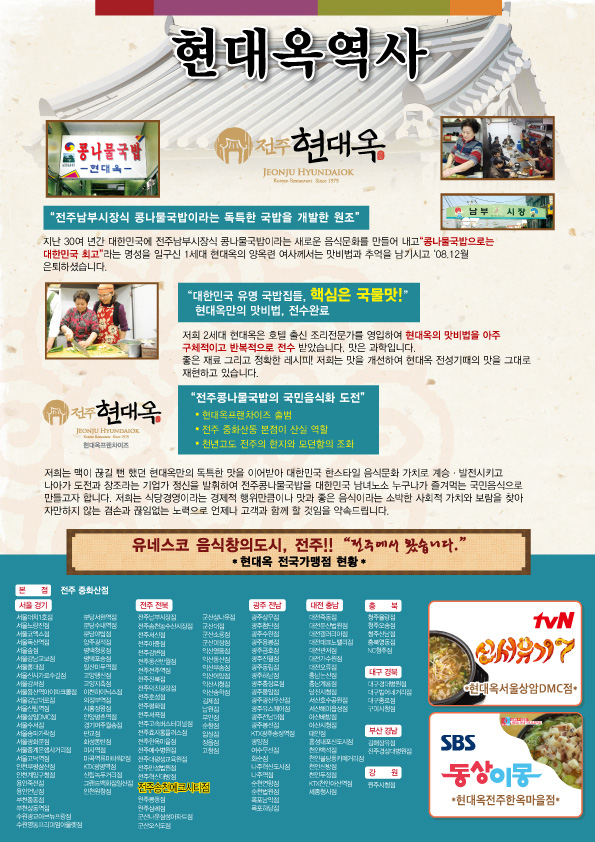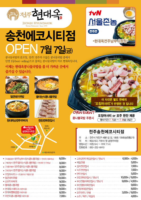 송천동 에코시티 인근 직장인들과 주민들께서도 이제 가까운 곳에서 현대옥을 만나 실 수 있게 됐습니다. 맛과 위생 친절에 최선을 다하여 "우리동네 1등식당, 현대옥"으로 보답해 드리겠습니다.