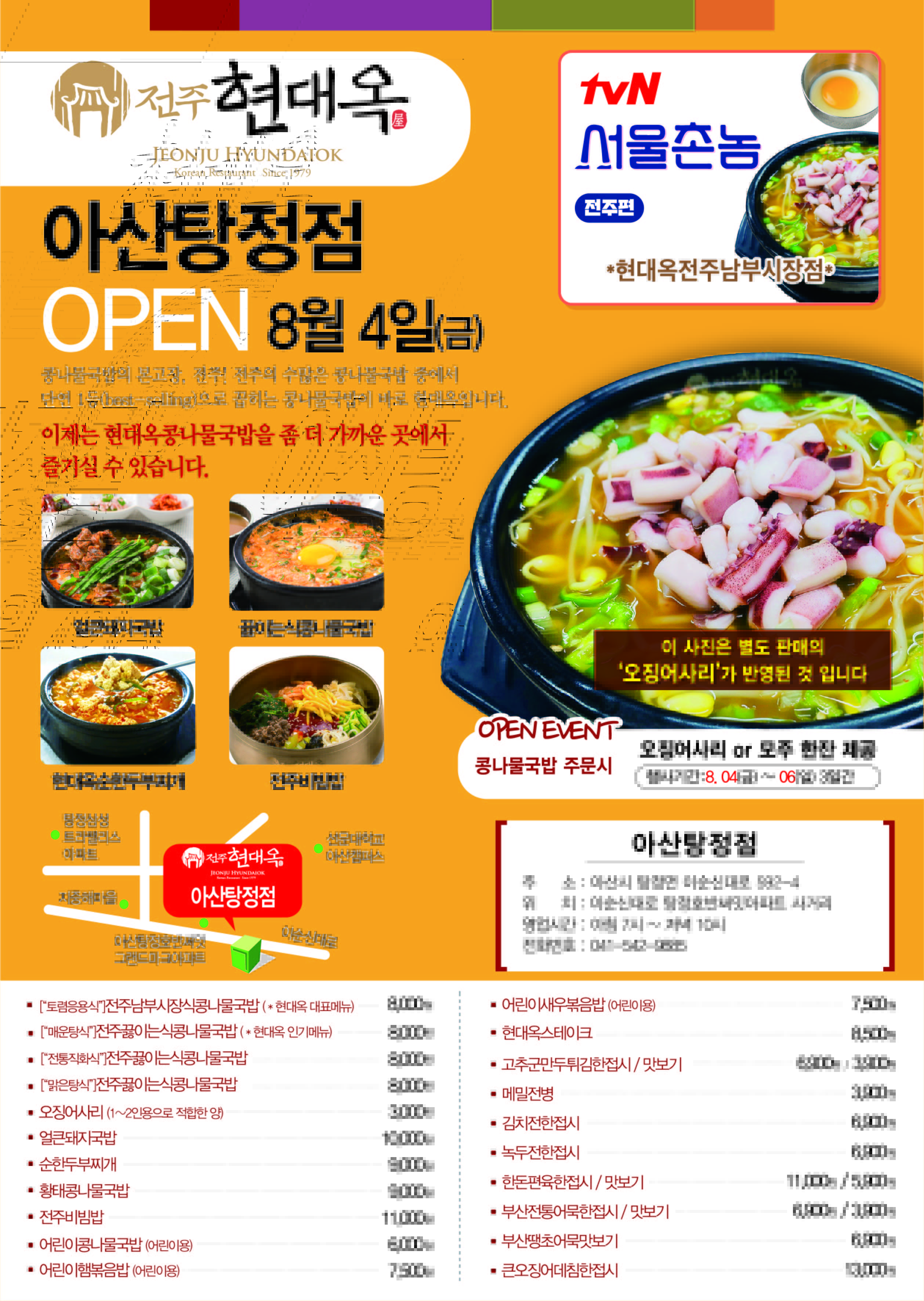 오늘자 충남 아산시 탕정면에 현대옥 아산탕정점이 오픈하였습니다. 탕정면 인근의 직장인들과 주민들께서도 이제 "전주에서 온 진짜배기,  전주현대옥콩나물국밥"을 가까운 곳에서 즐기실 수 있게 됐습니다.