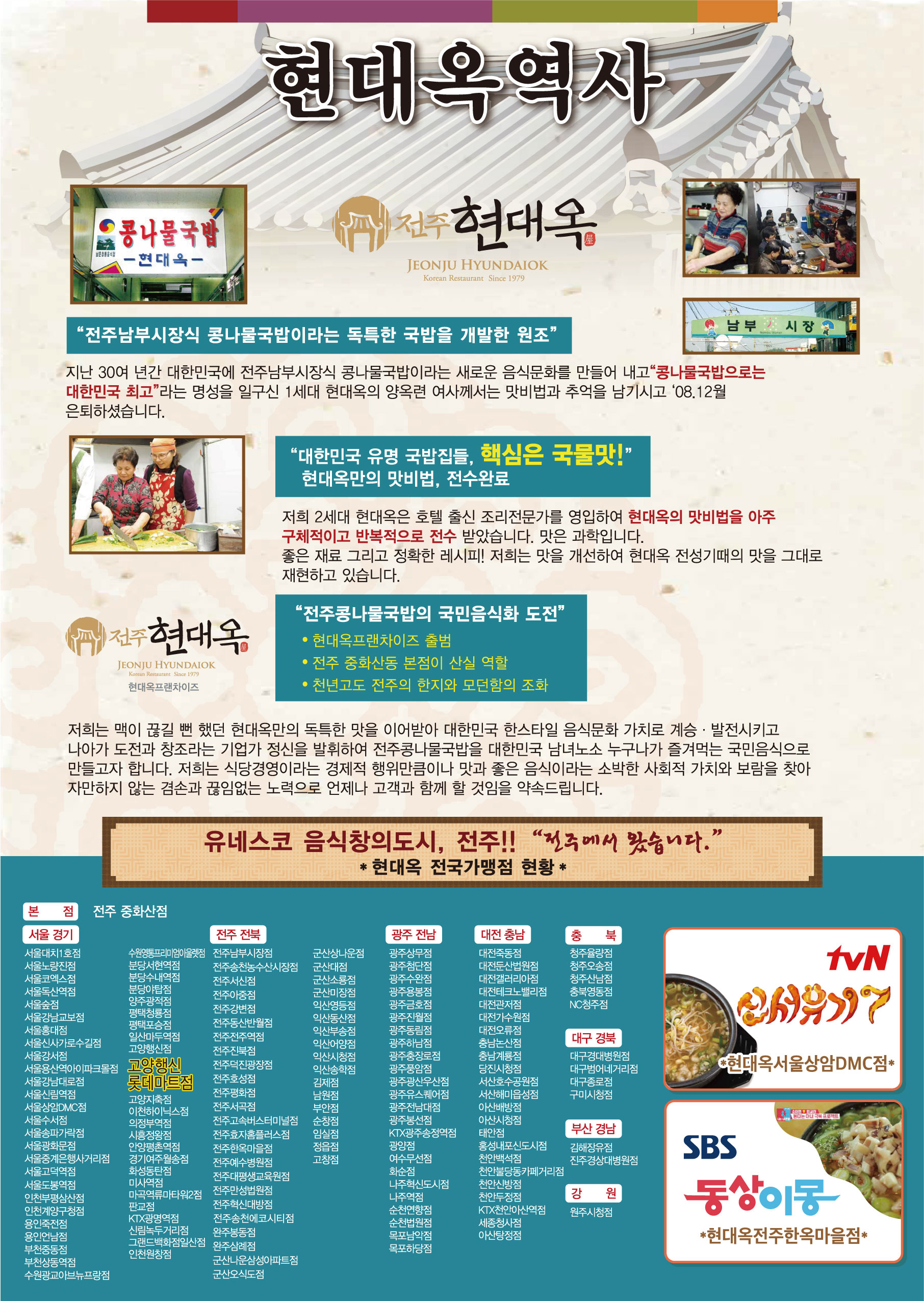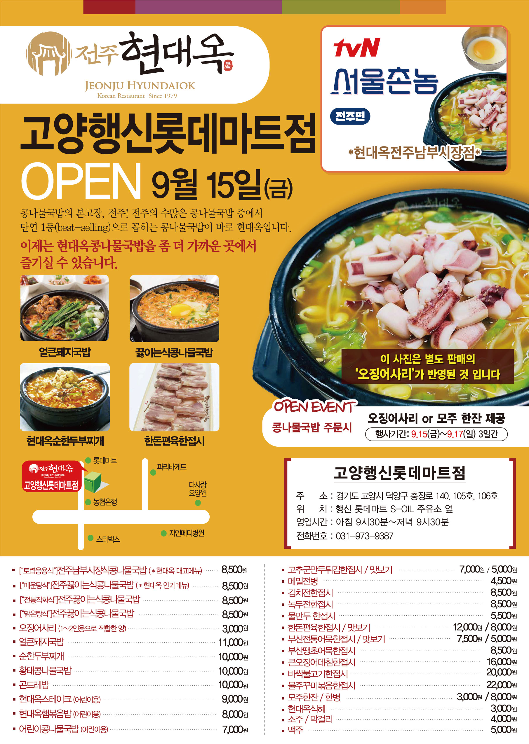 인근의 직장인들과 주민들께서도 이제 "전주에서 온 전주콩나물국밥, 현대옥"을 좀 더 가까운 곳에서 즐기실 수 있게 됐습니다. 맛, 위생, 친절 등 최선을 다하여  "우리동네 1등 식당, 현대옥' 으로 사랑받을 수 있도록 하겠습니다.