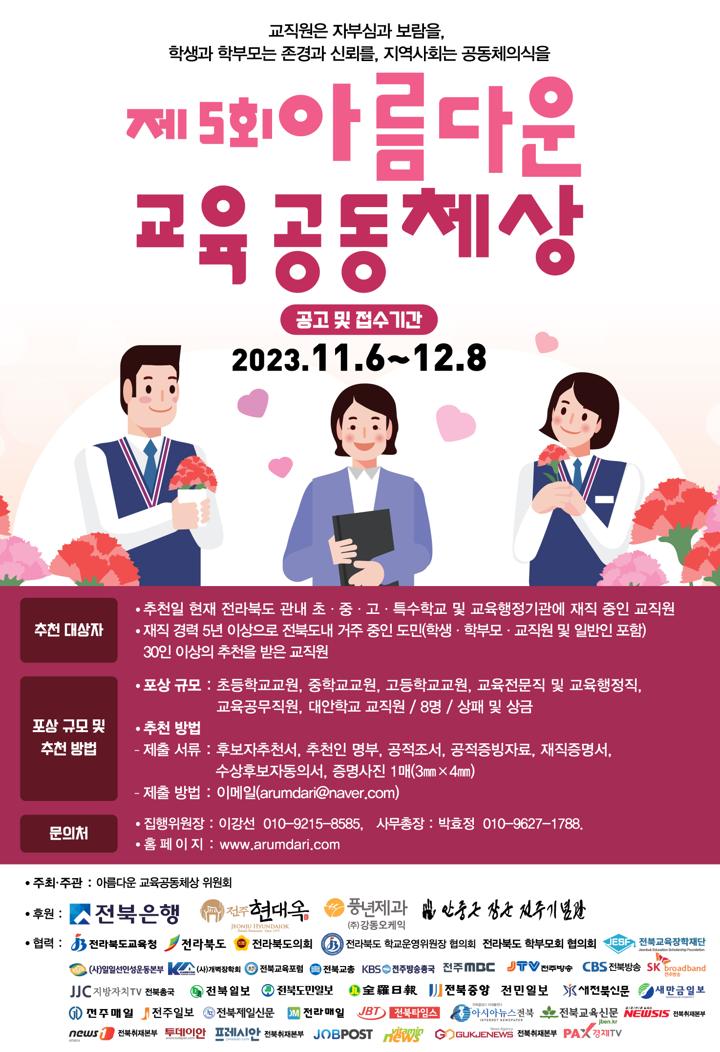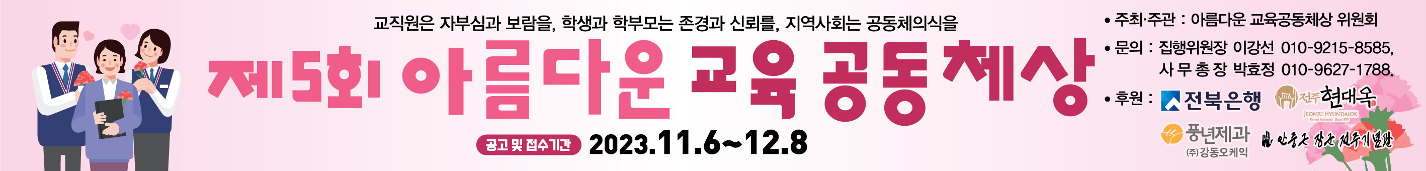 '아름다운교육공동체상' "교직원은 자부심과 보람을학생과 학부모는 존경과 신뢰를지역사회는 공동체의식을"의 슬로건으로 전라북도 관내  초, 중, 고 특수학교 및 교육행정기관에 재직중인 교직원을 대상으로 수상자를 선발하는 매우 뜻 깊은 행사입니다.