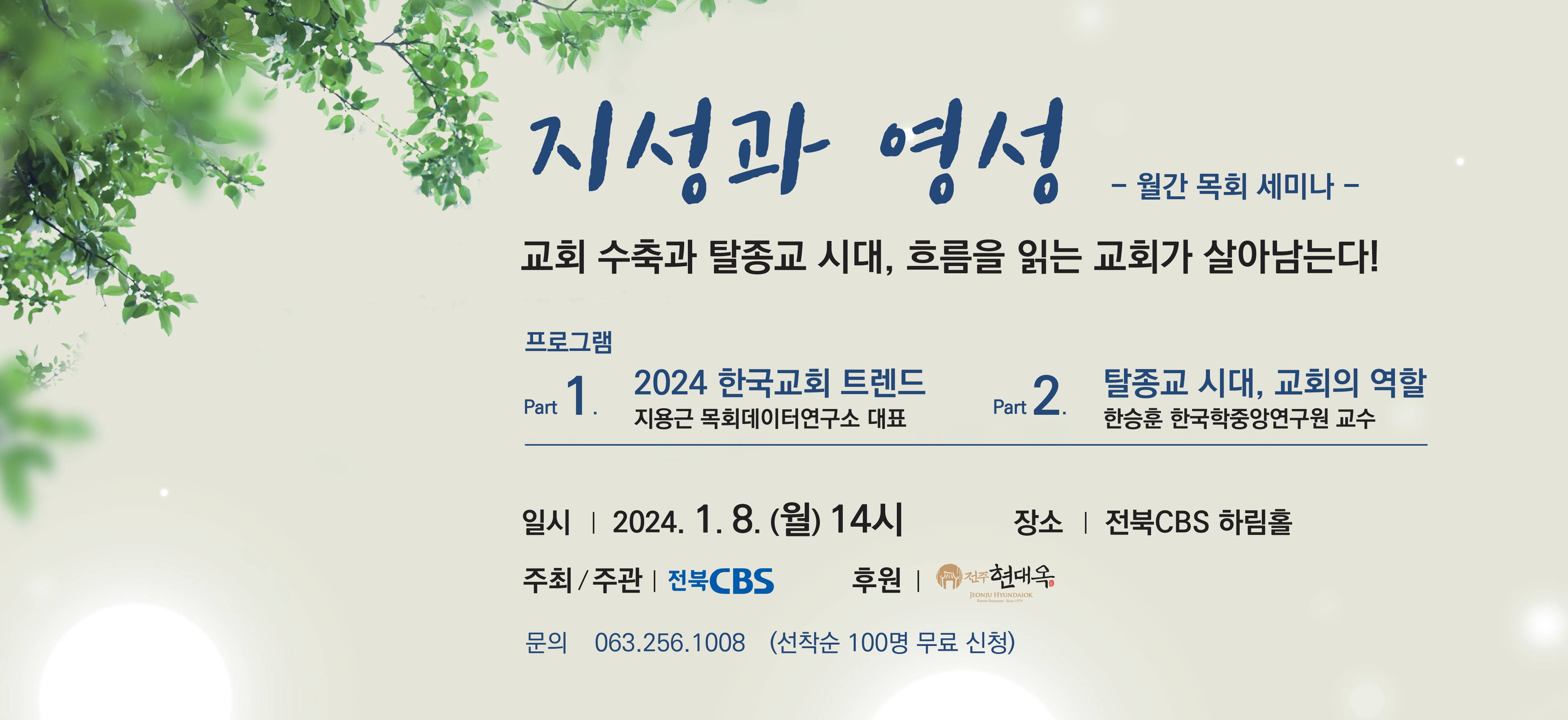 전북 CBS가 주관하는 '2024 월간 목회세미나'에 현대옥이 협찬 참여합니다. 행사 일시 및 장소는 2024년 1월 8일(월) 오후2시 전북 CBS 하림홀에서 진행됩니다. 이 행사에 대한 광고가 CBS 라디오를 통하여 어제부터 송출되고 있는데, 맨 마지막에는 "전주콩나물국밥 현대옥이 후원합니다"를 멘트하고 있습니다.