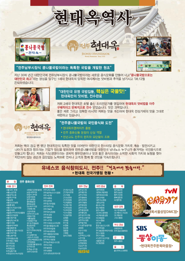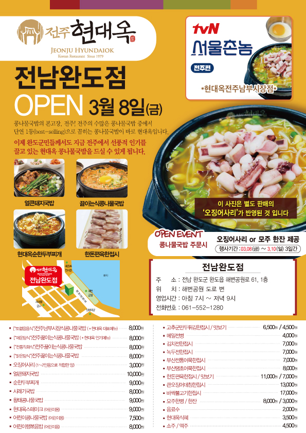 오늘자 전남 완도군 완도읍에 현대옥 전남완도점이 오픈하였습니다. 인근의 직장인들과 주민들께서도 이제 "전주에서 온 진짜배기,  전주현대옥콩나물국밥"을 가까운 곳에서 즐기실 수 있게 됐습니다.