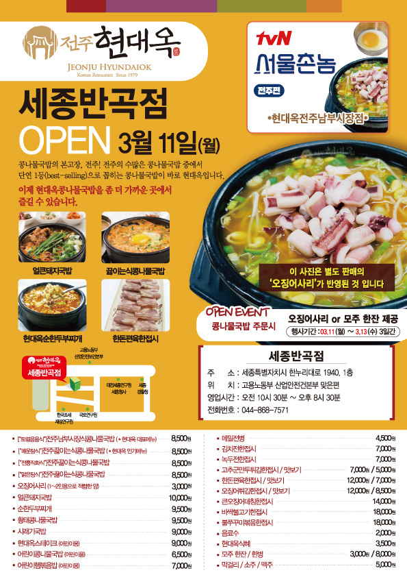 오늘자 세종특별자치시 반곡동에 현대옥 세종반곡점이 오픈하였습니다.