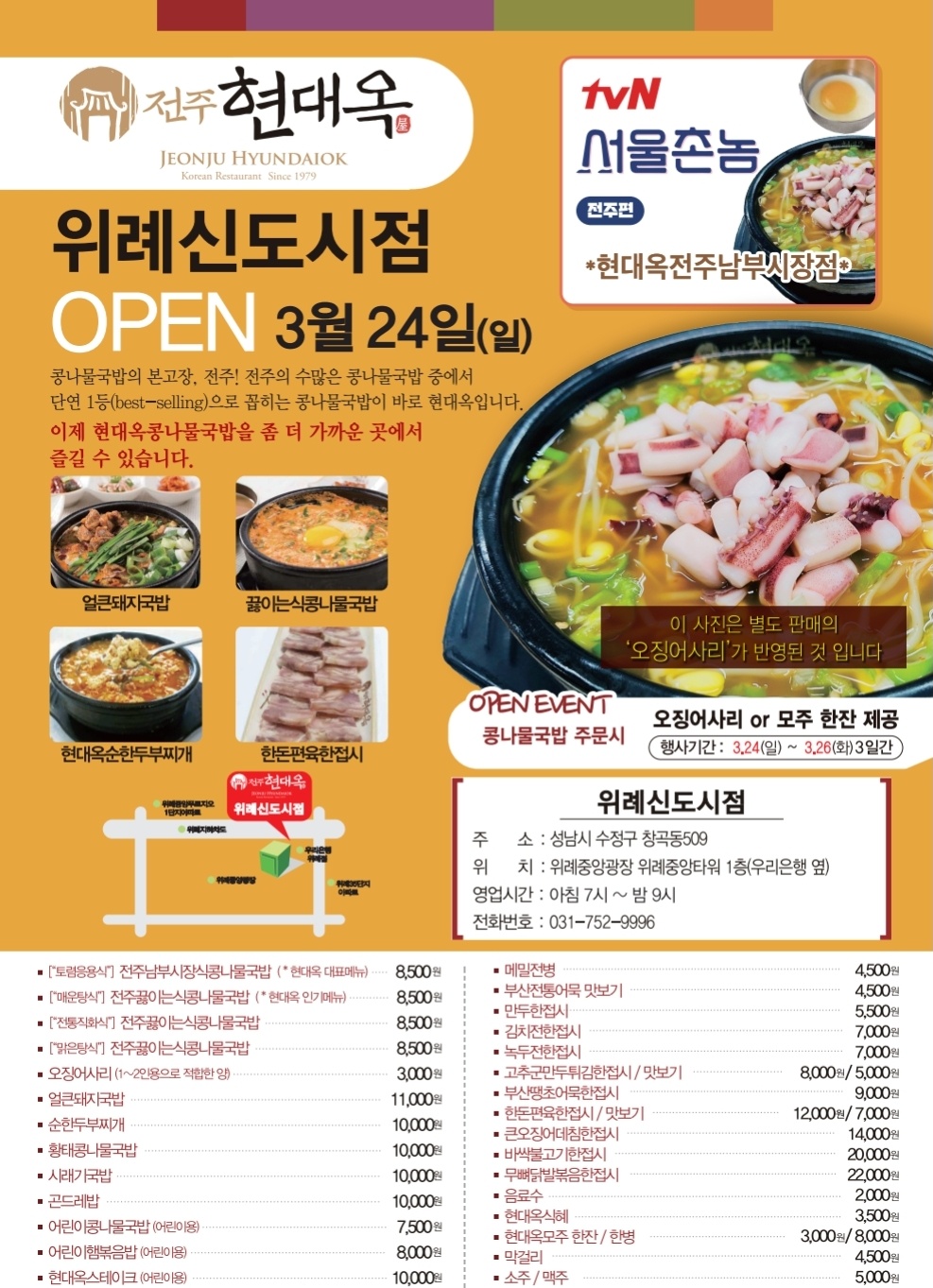 오늘자 경기도 성남시 위례신도시에 현대옥 위례신도시점이 오픈하였습니다. 인근의 직장인들과 주민들께서도 이제 "전주에서 온 전주콩나물국밥, 현대옥"을 가까운 곳에서 즐기실 수 있게 됐습니다.