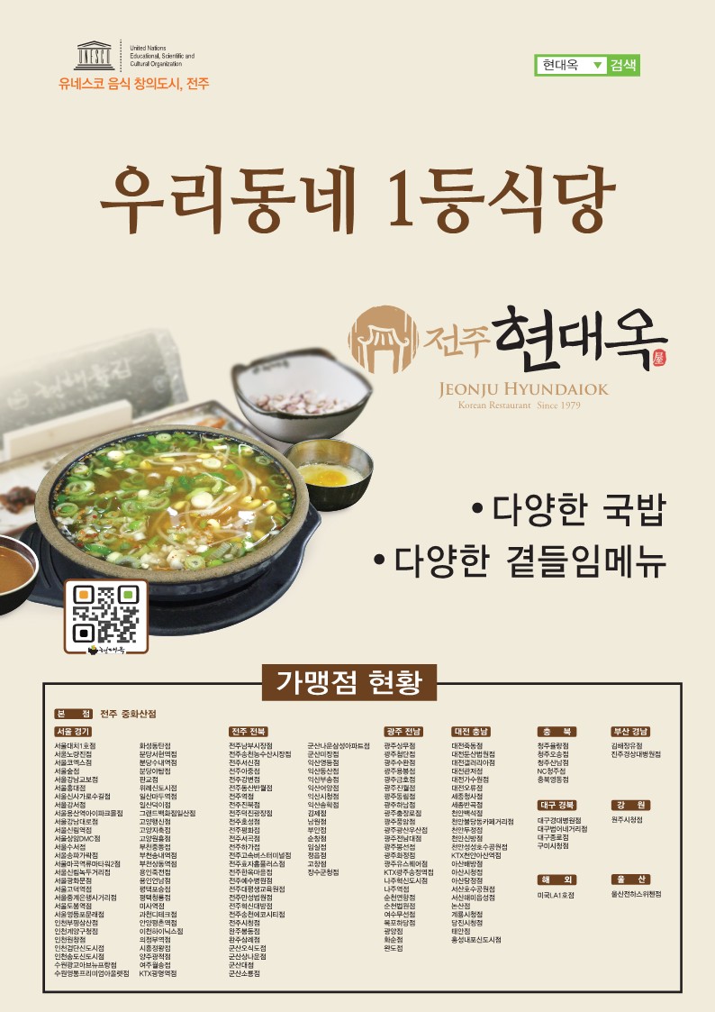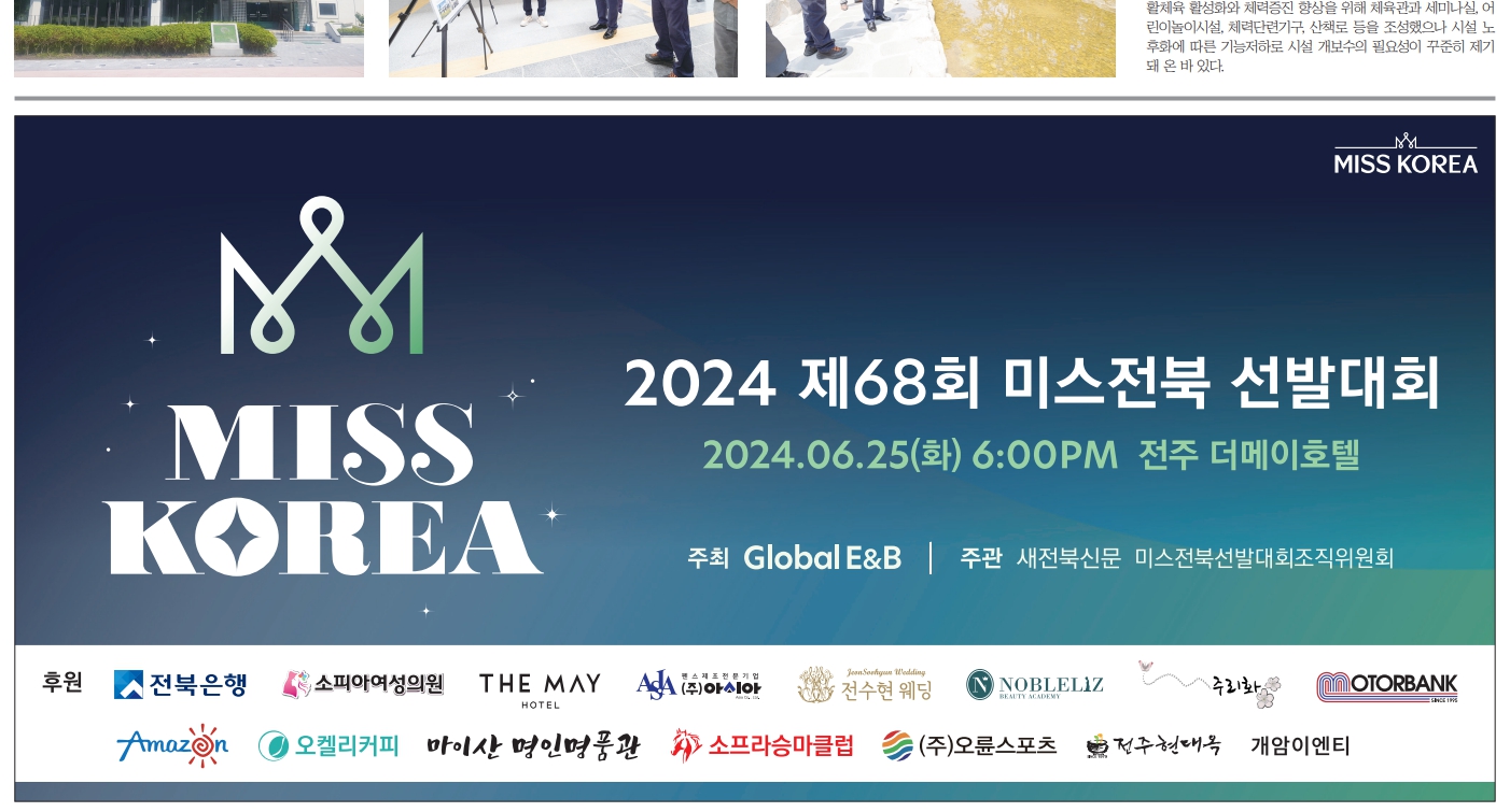 오는 6월 25일(수) 새전북신문 미스전북선발대회조직위원회가 주관하는 '2024 제68회 미스전북 선발대회'가 전주 더메이호텔에서 개최되는데, 이 대회에 저희 현대옥이 작년 재작년에 이어 금년에도 협찬 참여합니다. 새전북신문에서는 이 대회를 지속 광고 중인데, 여러 협찬처 중 하나로서 현대옥 로고가 지속 노출되고 있으며, 행사 팜플릿에도 A4크기 세로형의 현대옥광고가 게제됩니다. 저희 현대옥 가맹본부는 지난 10여 년 동안 전주전북 지역의 각종 문화체육 행사에 협찬해 왔는데 이러함들은 전주전북권 현대옥가맹점들의 영업력을 지원하게 되고, 전주전북권 현대옥가맹점들의 활발한 영업력은 결국 전국 가맹점으로 좋은 영향을 미친다고 봅니다. 저희는 앞으로도 꾸준히 지역사회의 여러 행사에 참여할 것입니다. 아래 새전북신문 광고 사진과 팜플릿 게제의 광고 디자인을 첨부해 놓습니다. <새전북신문 광고 사진>