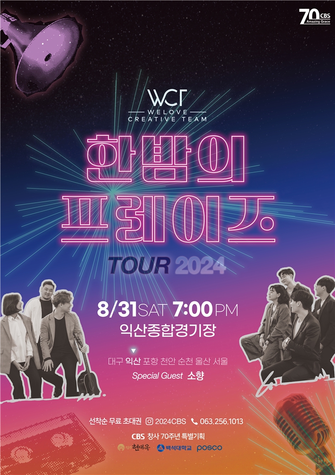 CBS 창사 70주년 기념 특별 기획 '한밤의 프레이즈 X 위러브' 전국 투어 공연에 현대옥이 협찬 참여합니다. 본 공연은 대구 공연을 시작으로 익산 포항 천안 순천 울산 서울 지역에서 진행 되는데 전북 익산 공연은 오는 8월 31일(토) 저녁 7시 익산종합운동장에서 진행됩니다. 본 공연을 알리는 포스터와 유튜브 인스타그램 등에 노출되는 홍보영상에는 저희 현대옥 로고가 노출 됩니다. 저희 현대옥은 금번 공연 협찬을 통하여 관람객들에게 현대옥에 대한 좋은 이미지를 주고 이로써 현대옥 가맹점들의 영업력 향상에 조금이나마 도움이 되기를 기대합니다. 아래 공연 포스터와 홍보영상을 첨부해 놓습니다. <포스터>