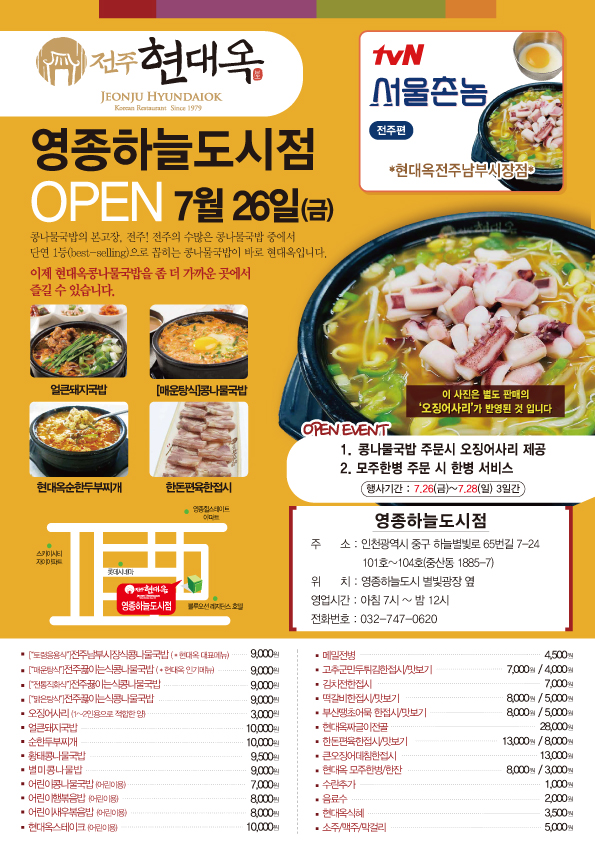 오늘자 인천광역시 중구 영종하늘도시에 현대옥 인천영종하늘도시점이 오픈하였습니다.