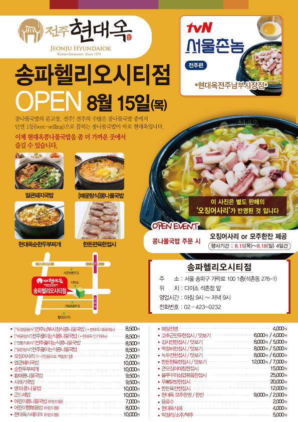 오늘자 서울 송파구 석촌동 헬리오시티아파트 단지 인근에 현대옥이 오픈하였습니다.