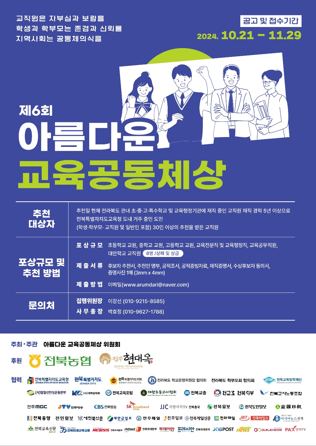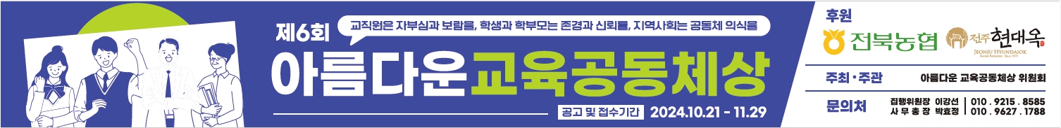 이 상은 "교직원에게는 자부심과 보람을, 학생과 학부모에게는 존경과 신뢰를, 지역사회에서는 공동체의식을" 이라는 슬로건을 바탕으로 전북특별자치도 내 초·중·고등학교, 특수학교, 교육행정기관에서 재직 중인 교직원을 대상으로 수상자를 선발하는 뜻깊은 행사입니다.