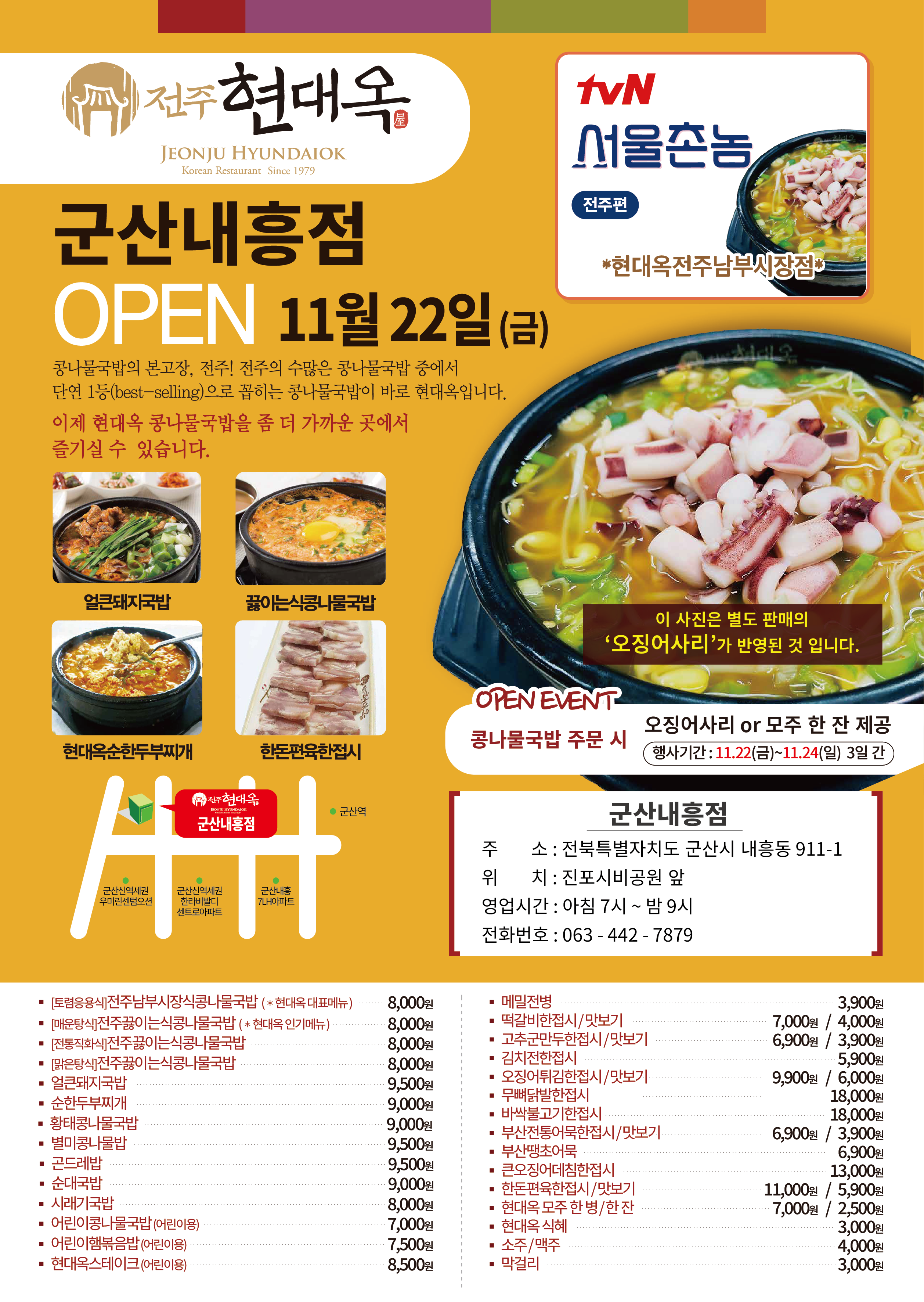 오늘자 전북특별자치도 군산시 내흥동 군산신역세권에 현대옥 군산내흥점이 오픈하였습니다.