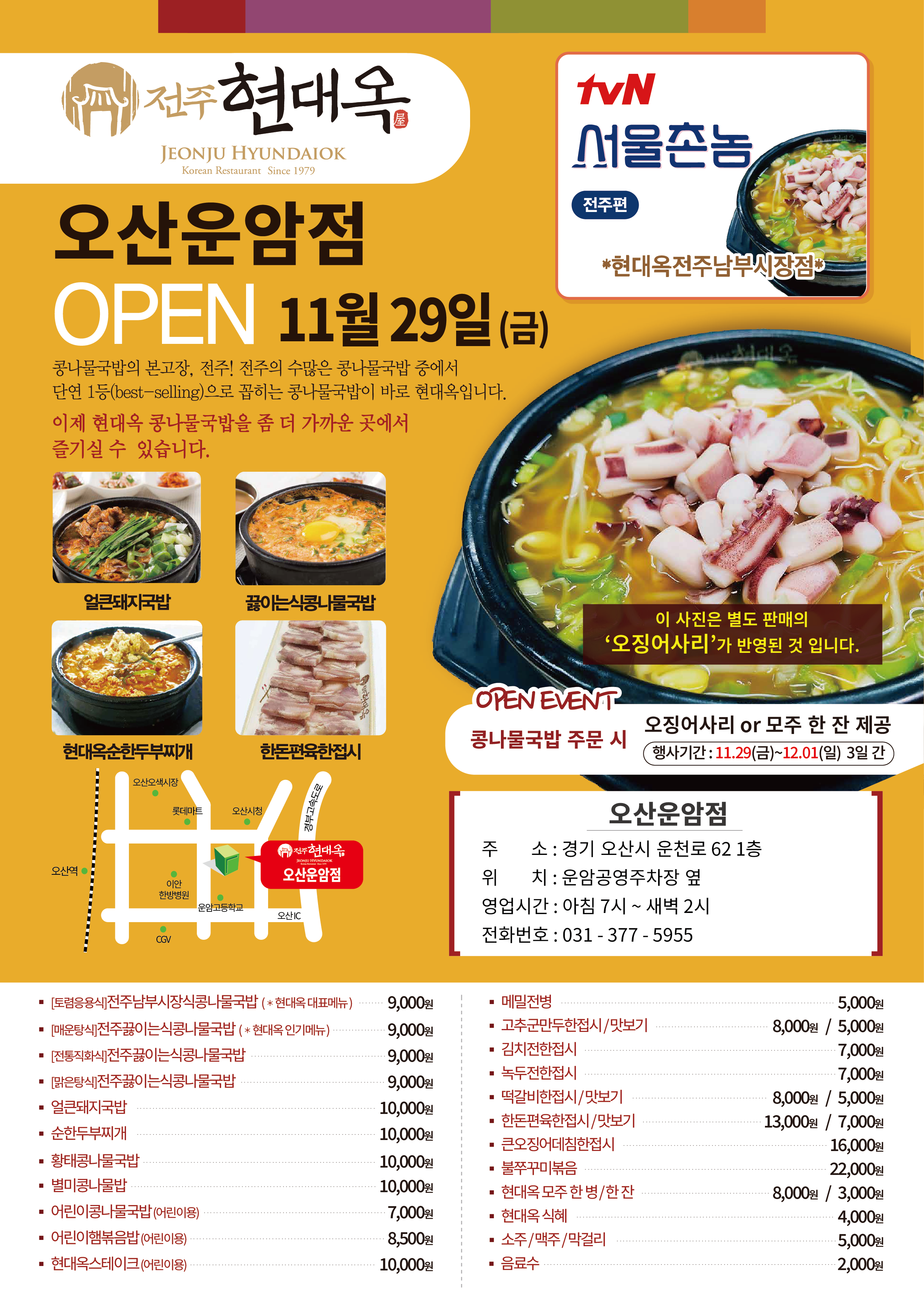 오늘자 경기도 오산시 원동 운암뜰먹자거리 인근에 현대옥 오산운암점이 오픈하였습니다. 인근의 직장인들과 주민들께서도 이제 "전주에서 온 콩나물국밥, 현대옥"을 가까운 곳에서 즐기실 수 있게 됐습니다.