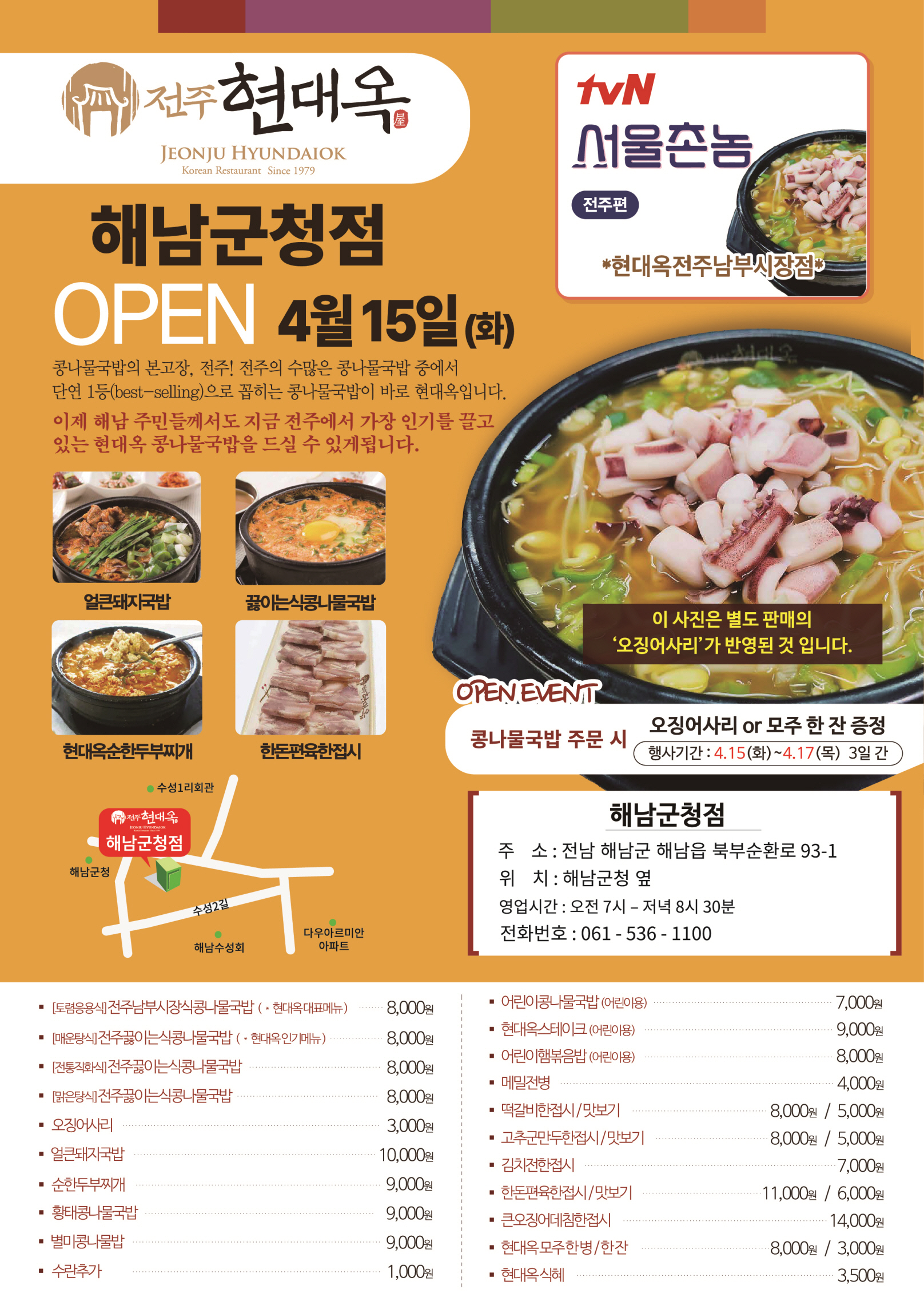 오늘자 전남 해남군 해남읍에 현대옥 해남군청점이 오픈하였습니다. 인근의 직장인들과 주민들께서도 이제 "전주에서 온 전주콩나물국밥, 현대옥"을 가까운 곳에서 즐기실 수 있게 됐습니다.