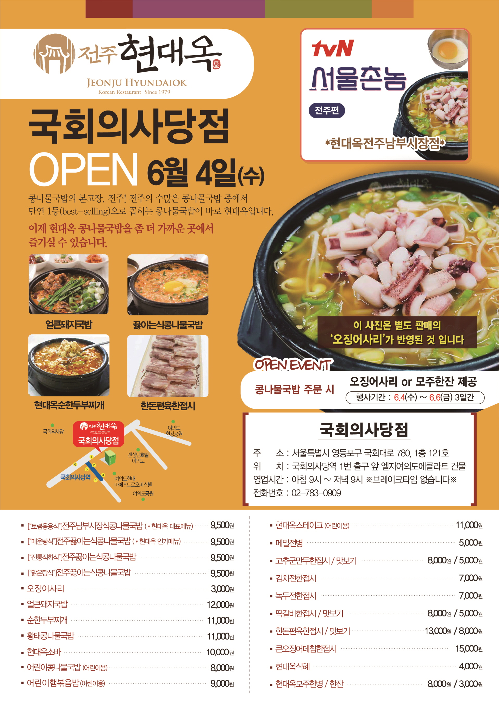오늘자 서울 영등포구 국회의사당역 인근에 현대옥 국회의사당점이 오픈하였습니다.