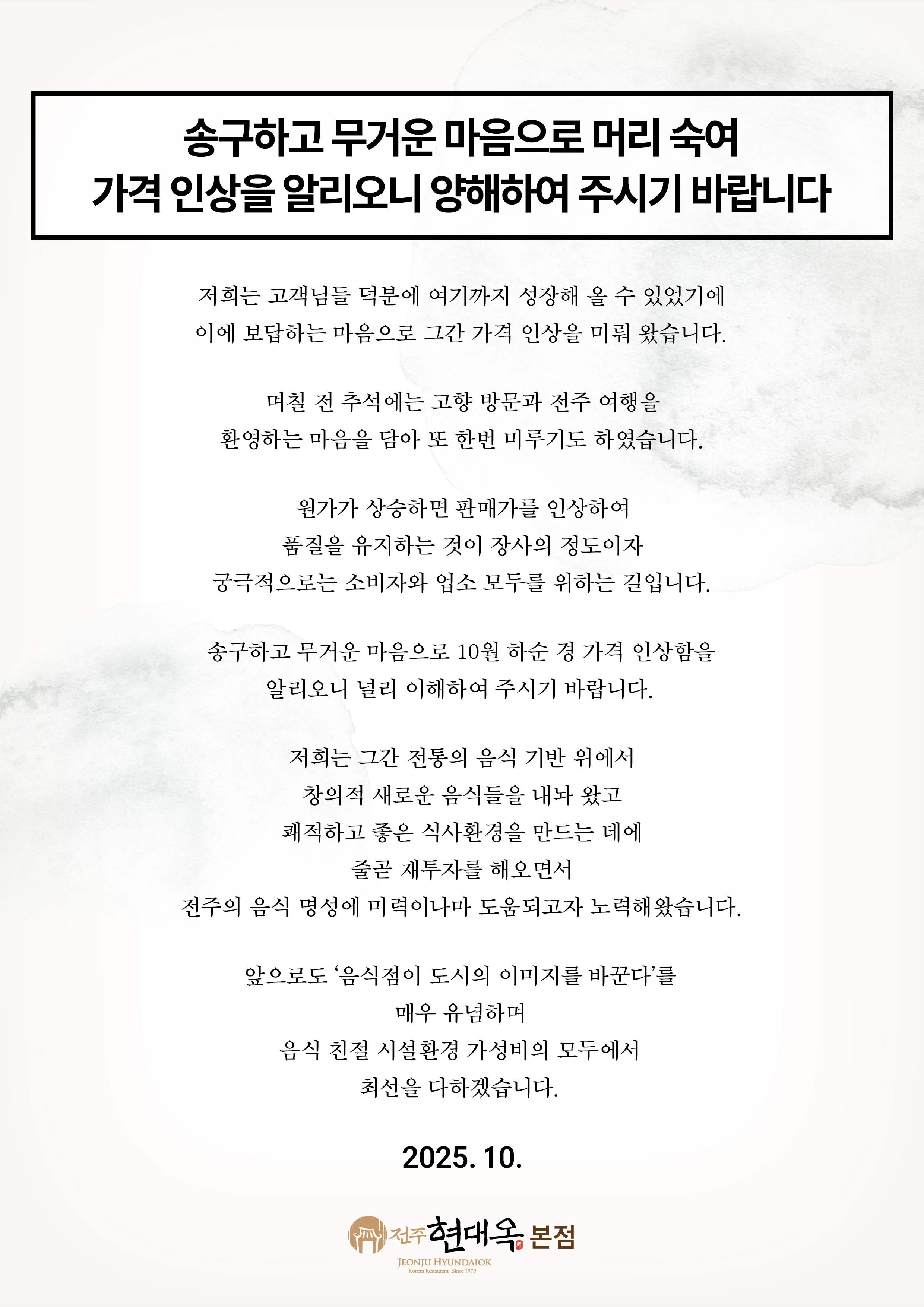 저희는 그간 식재료 원가와 인건비 등의 여러 가격 인상 요인에도 불구하고 차마 인상을 하지 못해 왔습니다. 한편으로는 고객님들 덕분에 여기까지 성장해 올 수 있었기에 그에 보답하는 마음으로 기꺼이 감내하고자 했습니다. 그러나 이제 여러 요인으로 더 이상 미룰 수 없기에 정말 죄송하고도 무거운 마음으로 가격 인상을 하게 됨을 알립니다. 음식점에서 원가가 상승하면 음식 수준을 떨어 트려 수지를 맞추는 것이 아니라 판매가를 인상하여 제품질을 유지하는 것이 소비자나 업소 모두에게 타당하다고 봅니다. 특히 전주는 전주한옥마을의 관광도시로서 많은 외지인들이 방문하는데, 전주의 음식 명성을 유지하는 데는 무엇보다도 음식의 질이 우선한다고 봅니다. 한편, 어느 업소의 음식 가격이 비싸고 싸고를 분별할 때는 단순히 그 숫자적 가격보다는 타 업소들과 '품질'을 견주어서 봐야 하기도 합니다. 저희는 '밥 콩나물 반찬 현대옥김'이 무한리필입니다. 식당들에서 공깃밥 추가가 대략 유료인데, 저희에서는 마음껏 더 드실 수 있으며, '현대옥김' 역시 여러 면에서 차별화된 것인데 마음껏 더 드실 수 있도록 셀프바 무한리필 비치하고 있습니다. 저희는 식재료와 반찬 부문에서도 많이 노력해 오고 있습니다. 대왕오징어보다 몇 배 고가의 일반오징어, 국산콩 콩나물, 오징어젓갈 등 고품질의 7가지 반찬, 국내산 김치 등이 그렇습니다. 그리고 시설환경과 위생에도 많이 노력하고 있는데, 고객 전용 주차장, 1인1벌 반찬, 깨끗한 식탁보, 고객대기실, 위생적인 수저 관리, 전직원 마스크 착용, 화장실 비데 등이 그렇습니다. 아주 어렵게 내린 결정으로서 '가격 인상'을 "붙임"과 같이 다시한번 안내하오니 양해하여 주시기 바랍니다. "붙임"의 안내는 A4 인쇄하여 현대옥본점의 각 테이블에 비치합니다. 한편, 현대옥가맹본부는 모든 현대옥가맹점들의 메뉴 가격을 자율에 맡겨 오고 있는데, 전주전북 이외 지역은 해당 지역의 외식물가 수준에 따라 거의 대부분이 9,000원이며, 전주전북은 8,000원입니다. 금번 본점의 가격인상 이후 각 가맹점에서의 가격 또한 각 가맹점의 자율임을 말씀드립니다. <본점 각 테이블에 비치하는 가격 인상 양해 말씀>