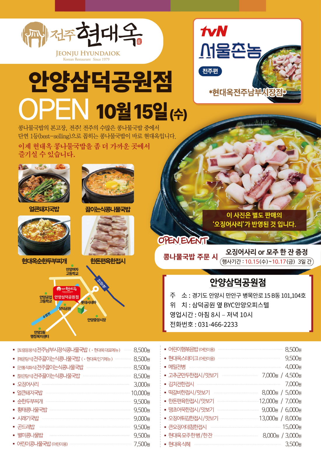 인근의 직장인들과 주민들께서도 이제 "전주에서 온 전주콩나물국밥, 현대옥"을 가까운 곳에서 즐기실 수 있게 됐습니다. 맛, 위생, 친절에 최선을 다하여 '우리동네 1등 식당, 현대옥' 으로 보답해 드리겠습니다.