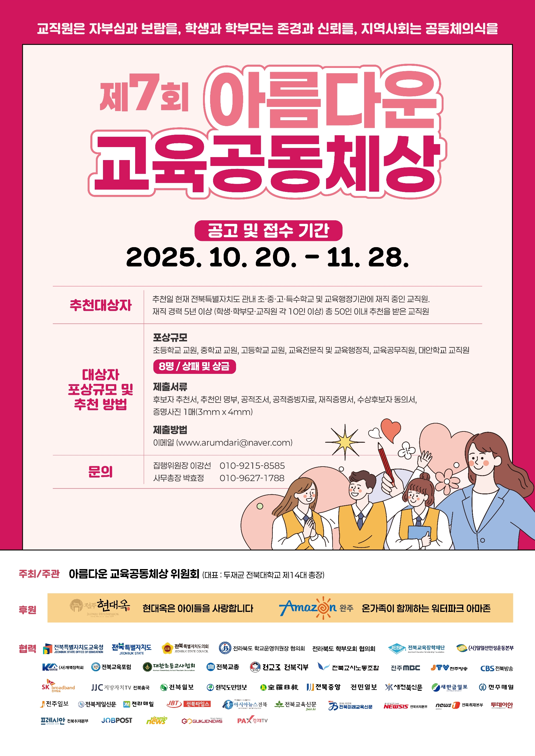 아름다운교육공동체상은 "교직원은 자부심과 보람을, 학생과 학부모는 존경과 신뢰를, 지역사회는 공동체의식을" 이라는 슬로건을 바탕으로 전북특별자치도 내 초·중·고등학교, 특수학교 및 교육행정기관에서 재직 중인 교직원을 대상으로 수상자를 선발하는 뜻깊은 행사입니다.
