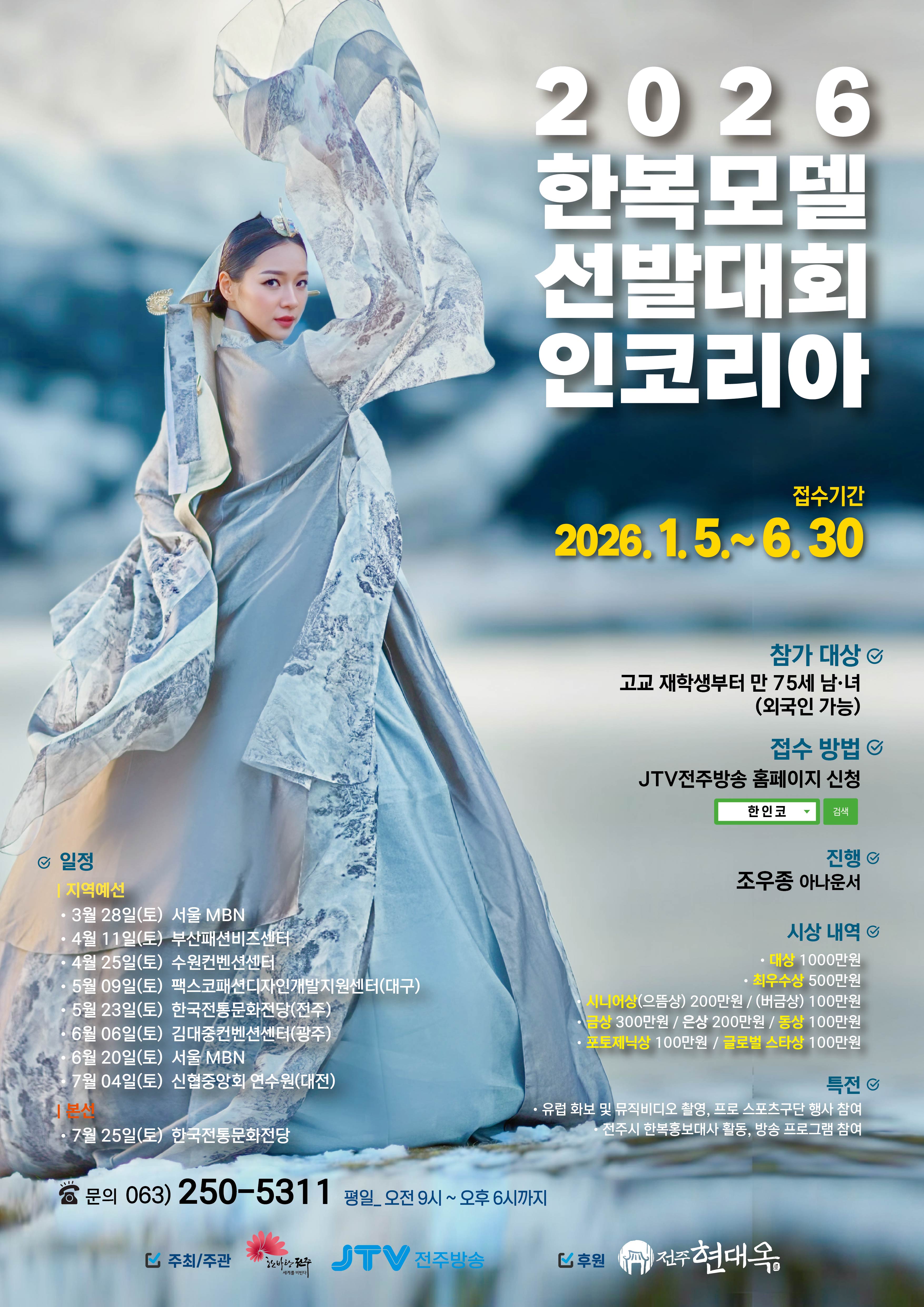 전주시와 JTV전주방송이 공동 주관하는 '2026 한복모델선발대회인코리아'에 현대옥이 재작년과 작년에 이어 올해도 협찬 참여합니다.