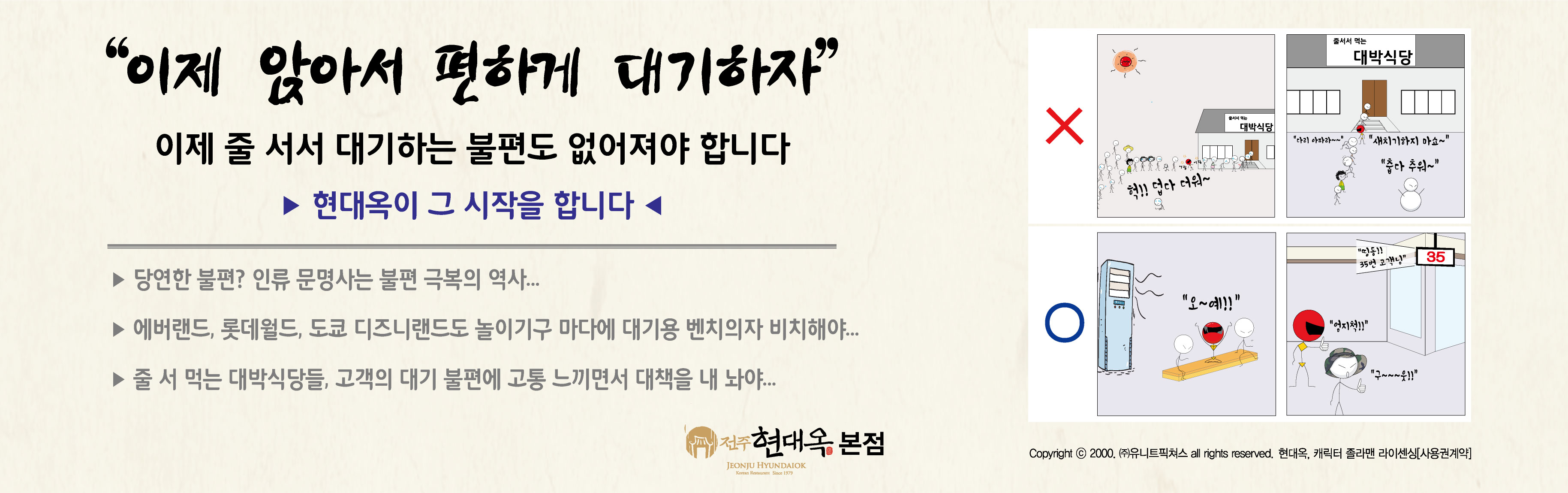 인류 문명사는 불편에 대한 개선의 역사일 것입니다. 이제 '줄 서 대기하는 맛집의 불편함에 대한 그 간의 당연시'에 대하여 누군가는 '아니다, 개선해야 한다'라고 외치고, 그 외침은 나비효과여야한다고 봅니다. 그리하여 언젠가는 '이 세상 줄 서 기다리는 것으로부터의 불편함'이 모두 거두어 내지고 '또 하나의 편익된 세상'이 만들어져 있어야 할 것입니다.
