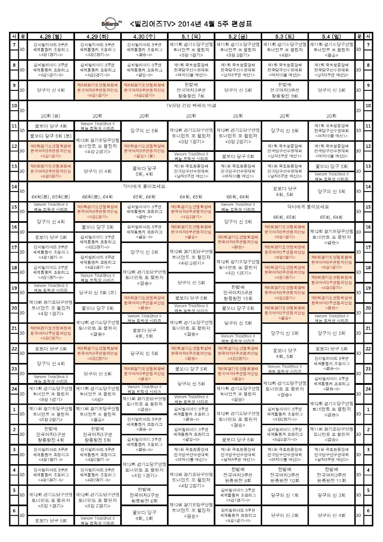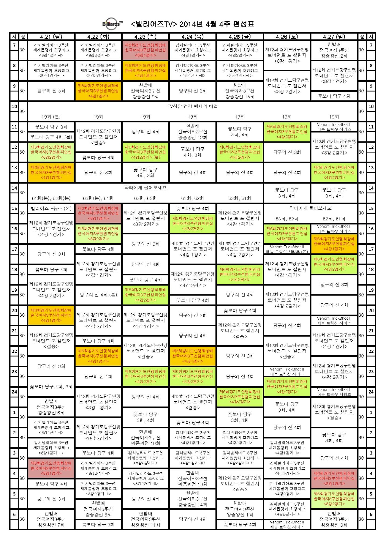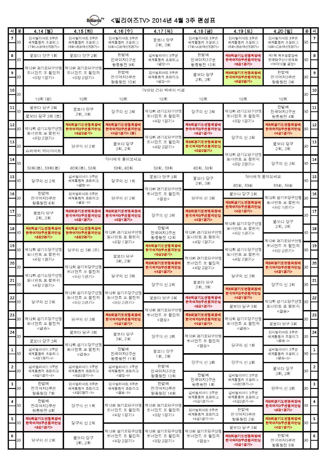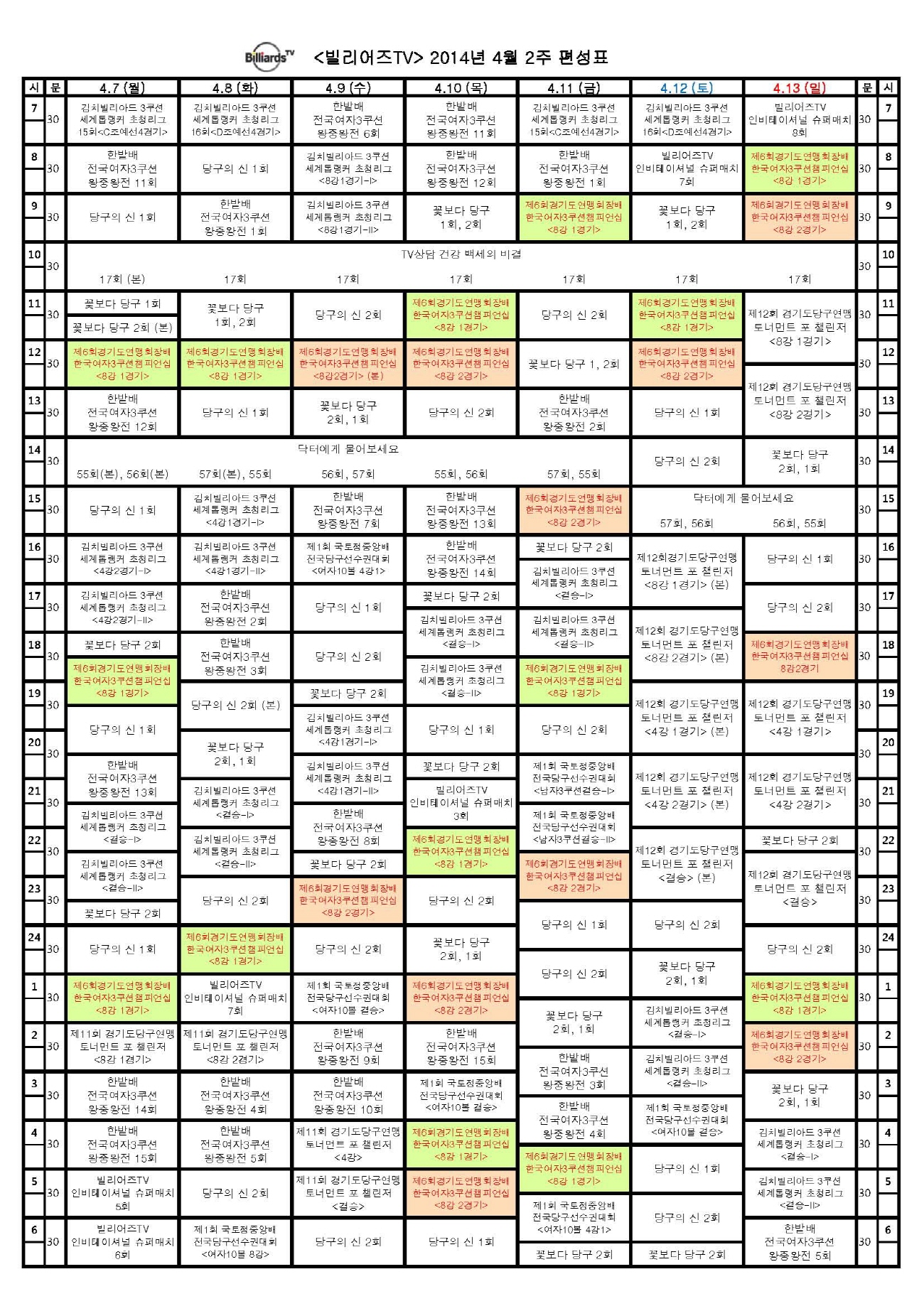 빌리어즈TV,한국여자3쿠션대회 방송분 동영상 보기및 4월 둘째 주 편성표