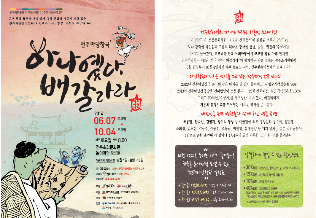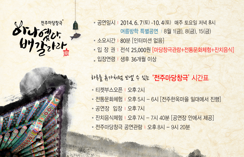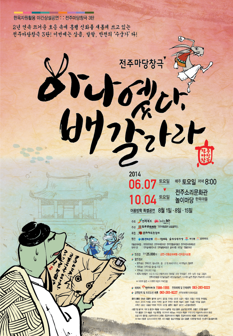 년간 5백만명의 관광객이 찾는 전주한옥마을에 소재한 '전주소리문화관 놀이마당'에서 공연될 토끼전 "아나옜다,